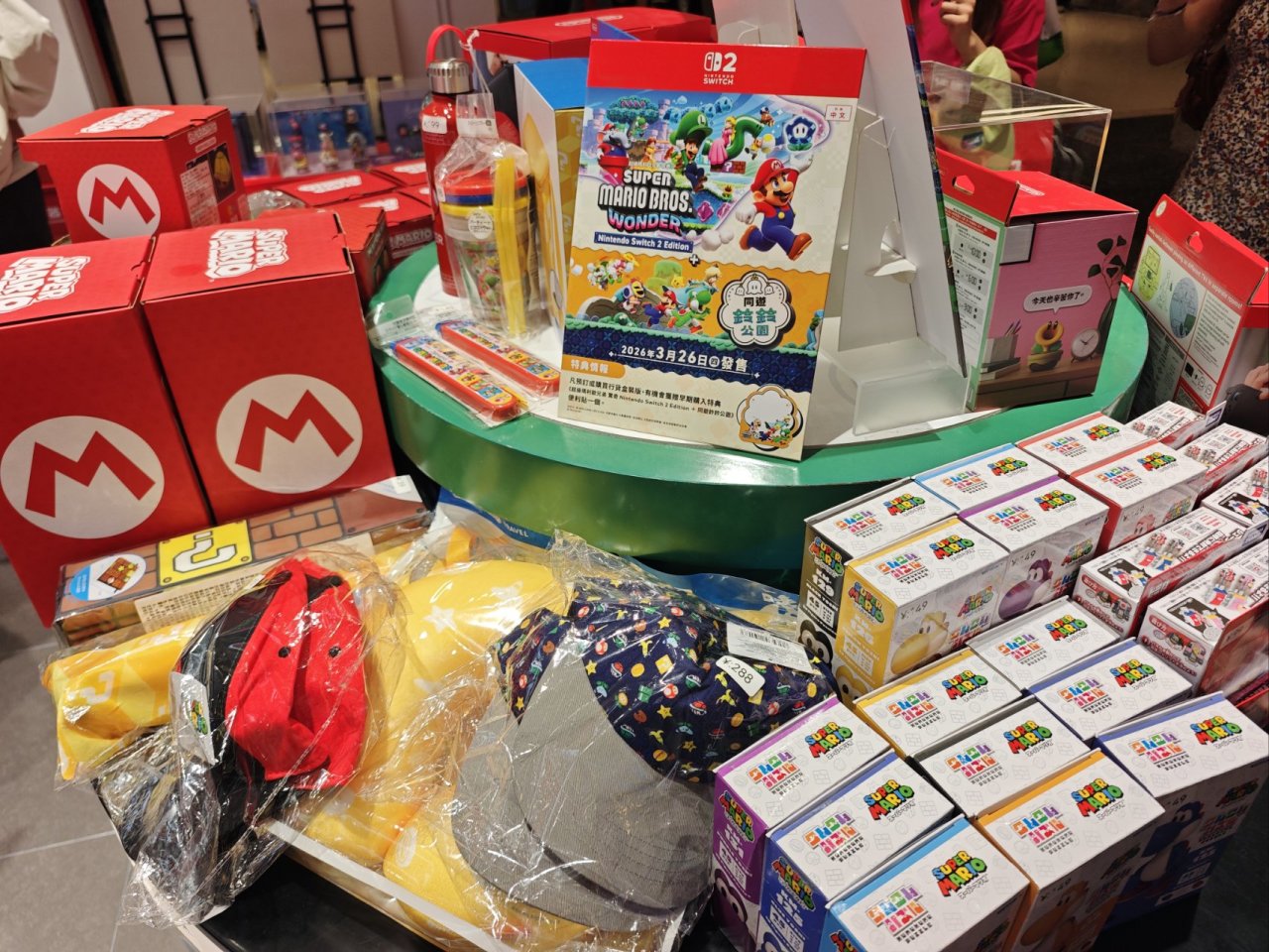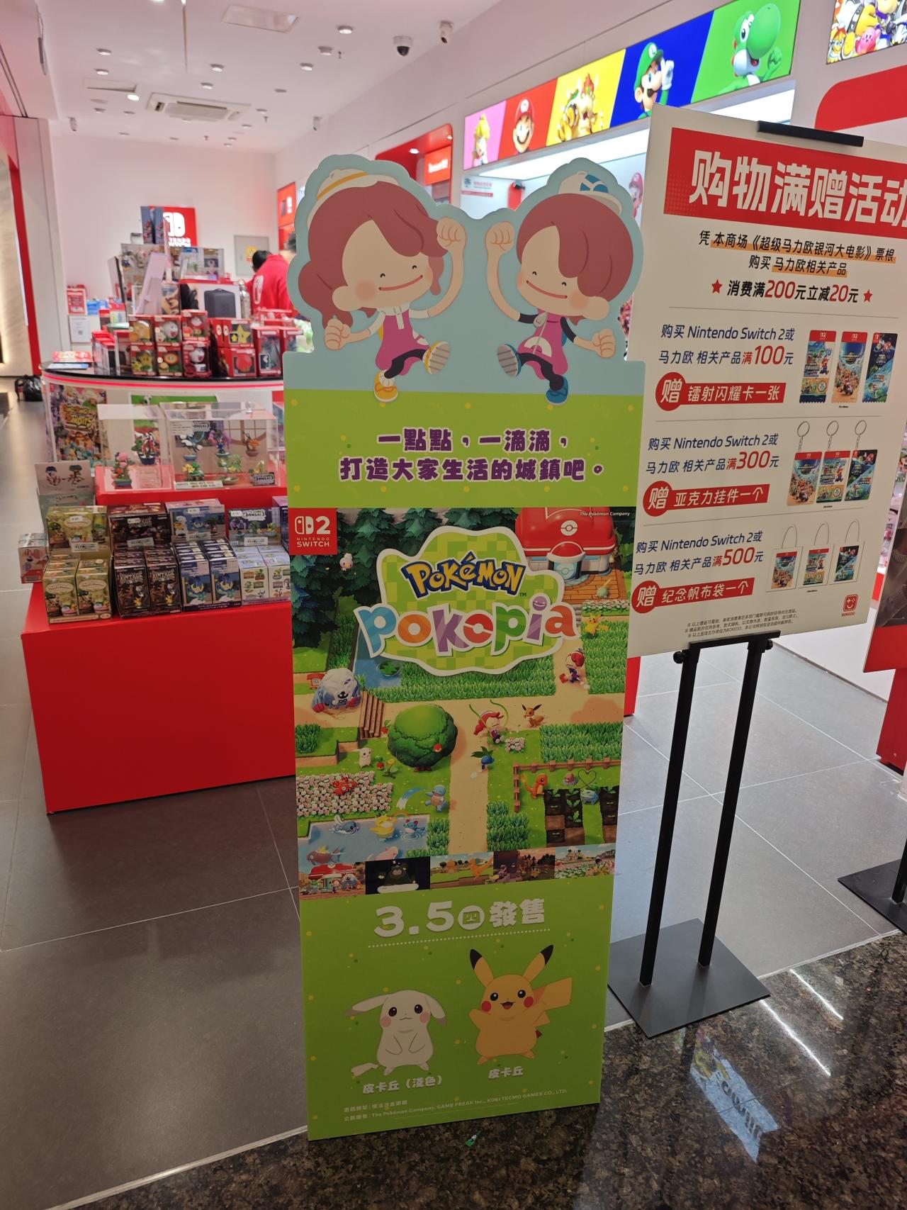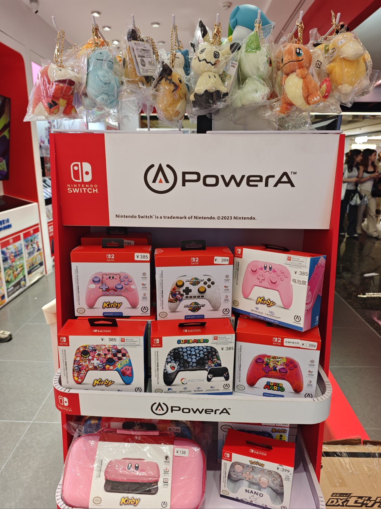 说回正题,进到店里,货品还是挺全的。店里展示的机器是港版机,也有马车同捆版。游戏方面相当齐,去年的大作像咚奇刚、赛车、卡比星耀世界都有,甚至连今年刚发售不久的Pokopia也有现货,还有线上渠道不好买到的动森2。配件方面,NS2 Pro手柄、紫绿撞色的JC也有,周边里还有闲聊花花,连良值这样的第三方配件也没落下。整体备货我觉得完全没问题,这一块可以给满分。