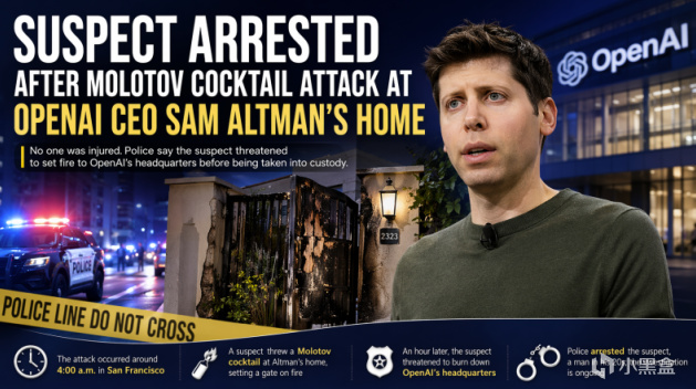 美国AI巨头OpenAI的CEO奥特曼(Sam Altman)位于旧金山的住宅遭到一名男子投掷燃烧物袭击。