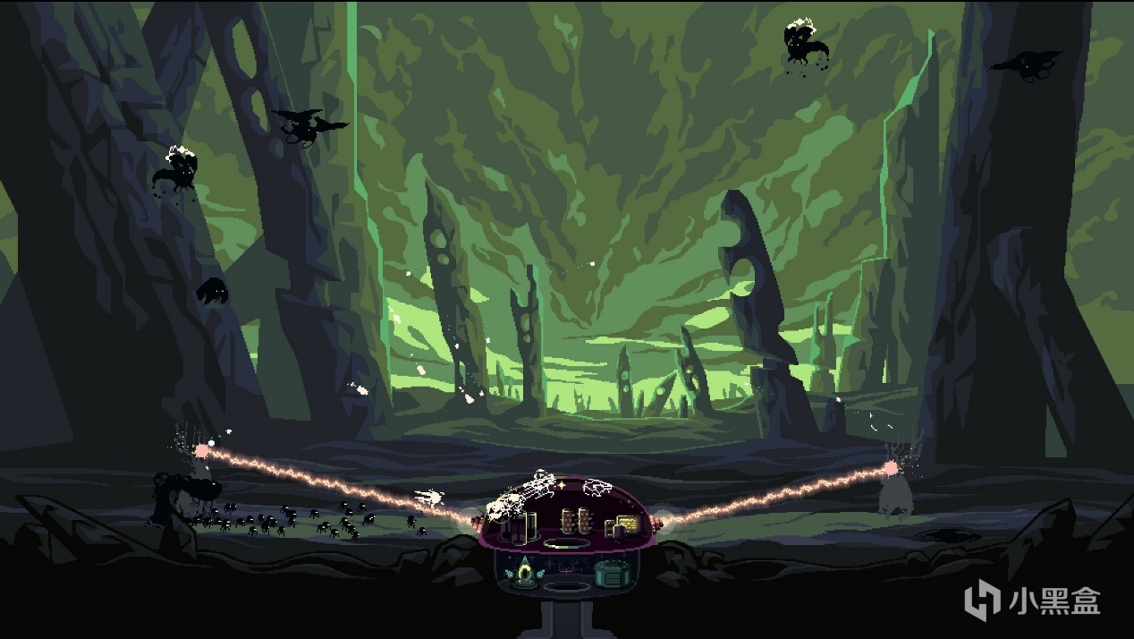 作为款采矿题材的动作肉鸽游戏,核心玩法是每隔一段时间外星怪物会攻击玩家的基地,入侵前的空闲时需要玩家抽空采集资源并赶在下一波攻击到来前返回基地。