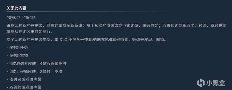 这次同步推出的全新付费DLC失落卫士,加入了两种新守护者,分别为渗透者与驭兽师,渗透者能飞索走壁,驭兽师可以驾驭触须并率领猫地精随从,多款多款全新皮肤,还有9项新任务、多种新宠物,以及两款专属游戏原声带使游戏整体配乐内容翻倍,进一步丰富沉浸体验。。