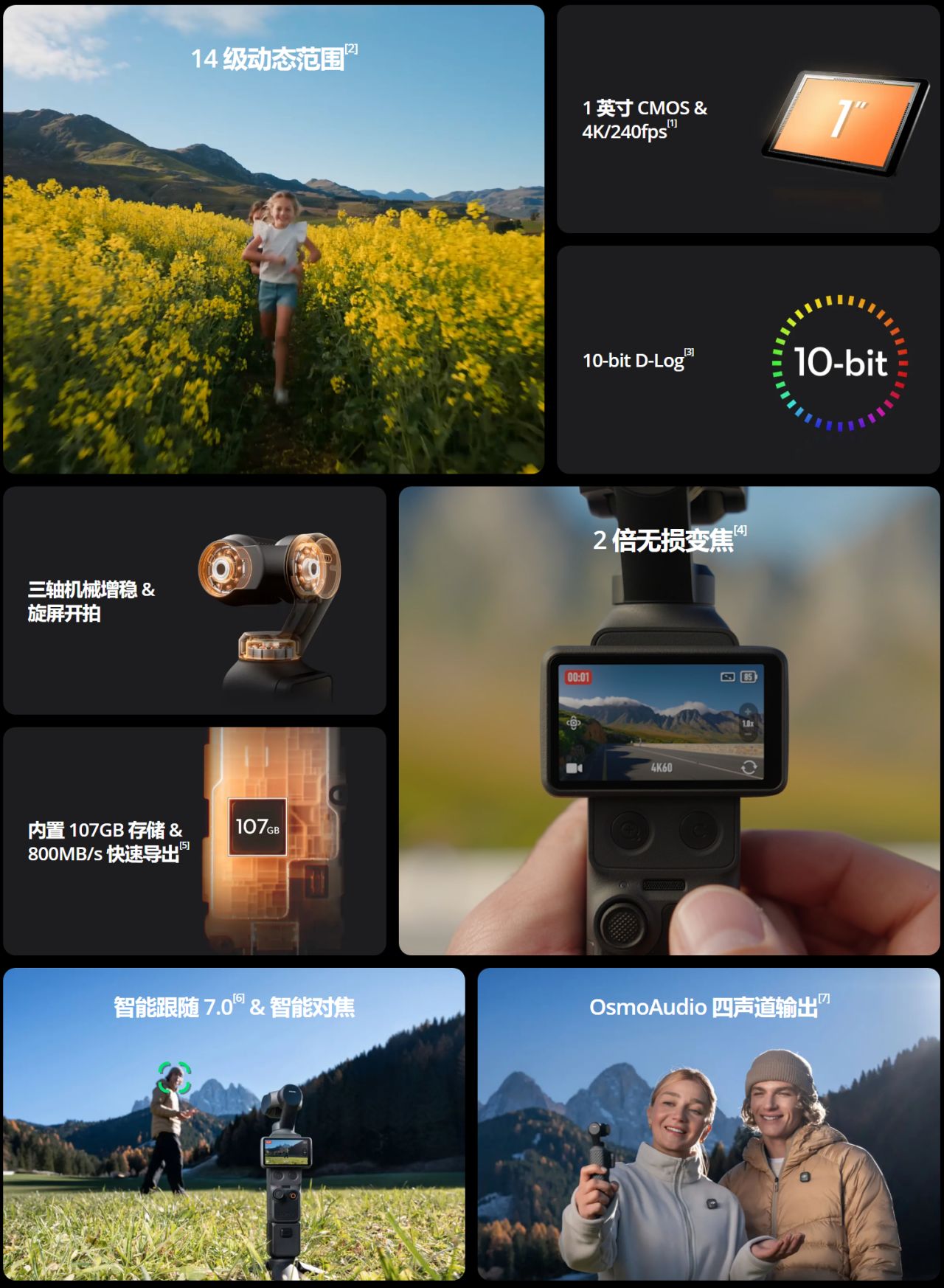 全新 1 英寸 CMOS 搭配 4K/240fps,首次支持 10‑bit D‑Log 专业色彩模式,更有 14 级动态范围,细腻还原光影层次。轻转屏幕,大片一拍即成。