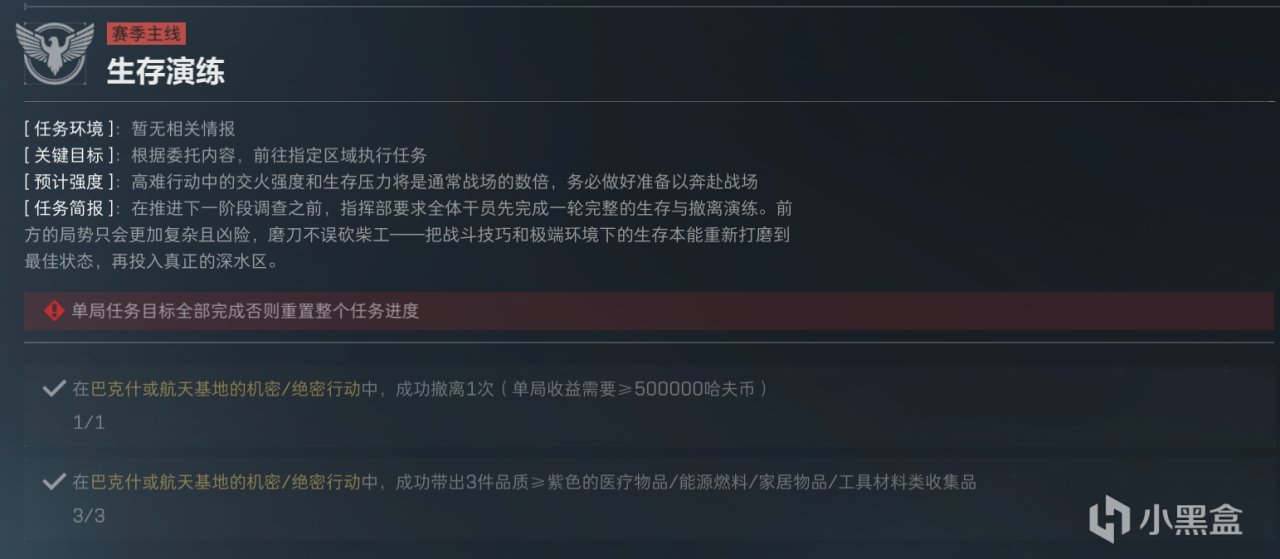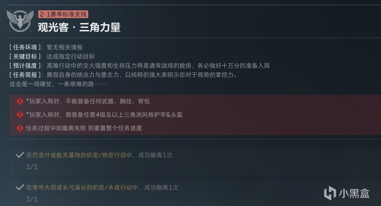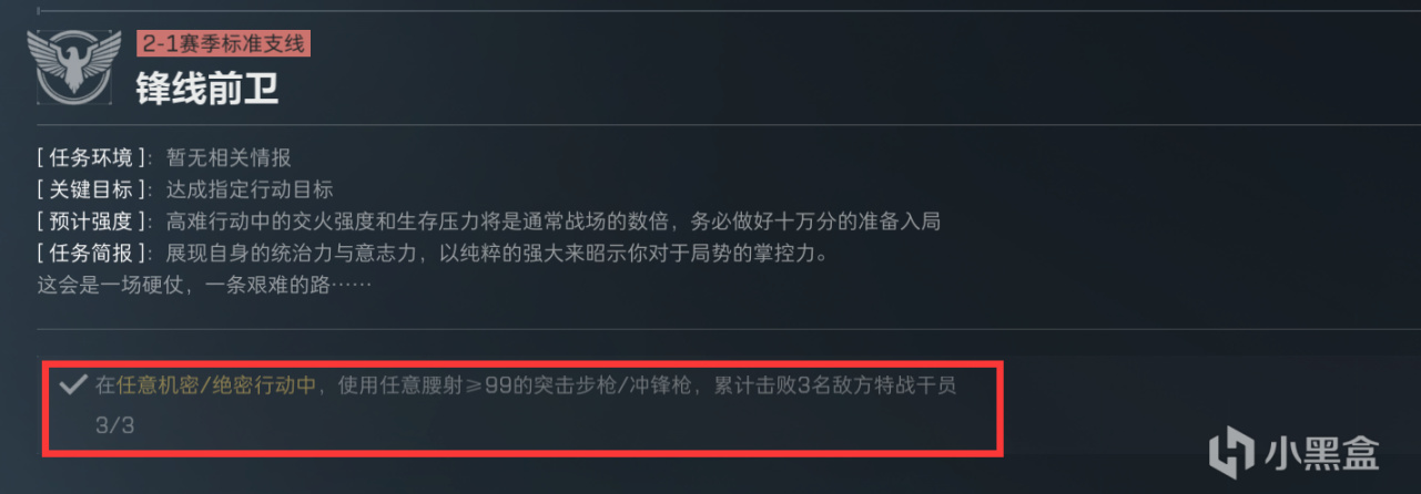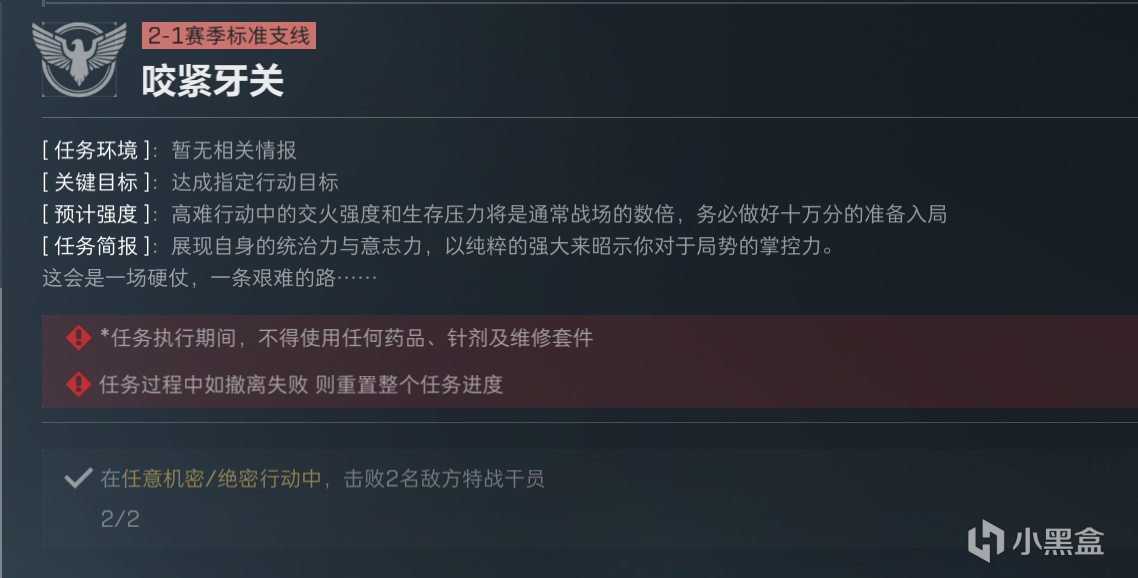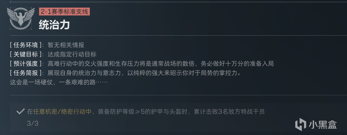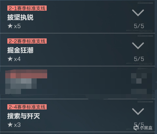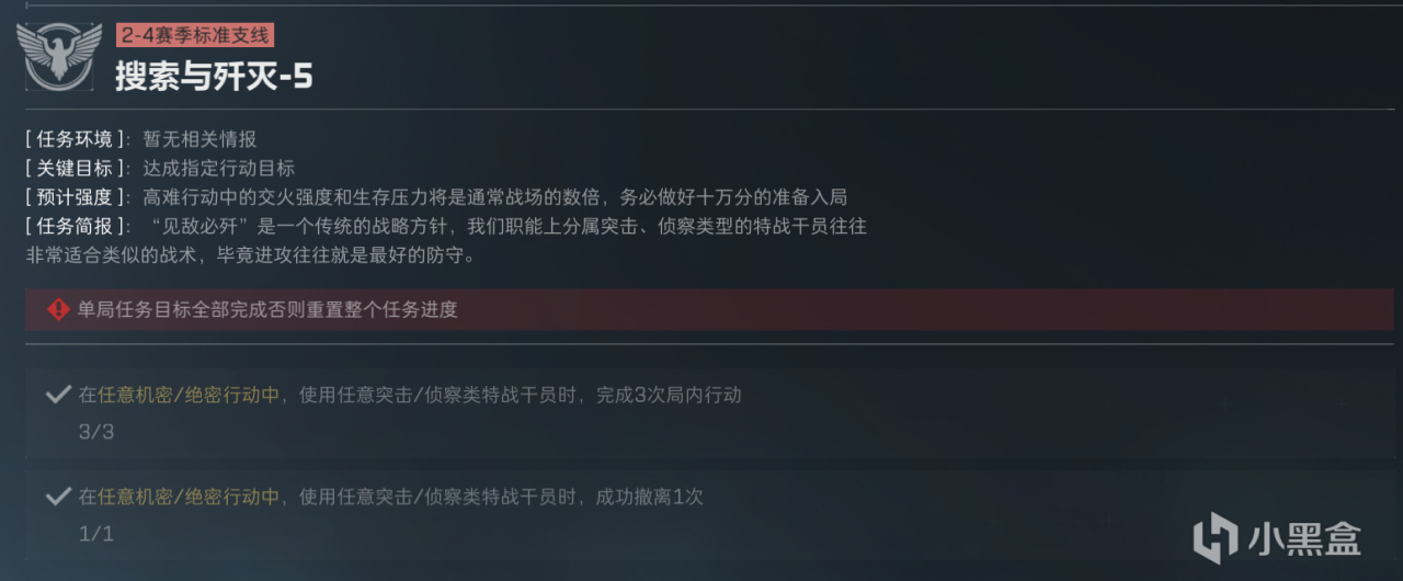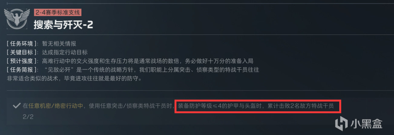 为什么单独先做一个搜索与歼灭2呢,因为它要求甲不能高于四级,而披肩执锐1任务的甲要求是五套,所以这个分支在首次击杀任务上会有一点分歧,不过问题不大。