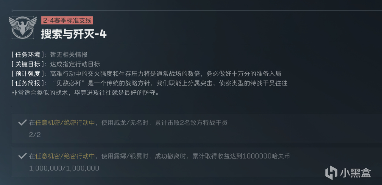 搜索与歼灭4有两个任务,一个是用威龙或者无名击杀两名干员,一个是露娜/老登撤离金额100W。