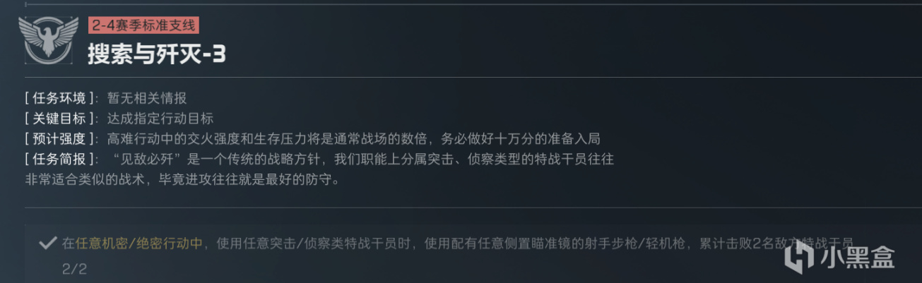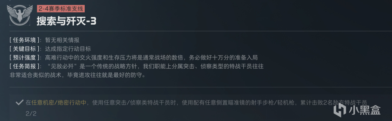 特别是披坚执锐、搜索与歼灭,里面的一些任务是环环相扣的,一个是特定武器击杀、一个是干员击杀,刚好可以组合在一起。