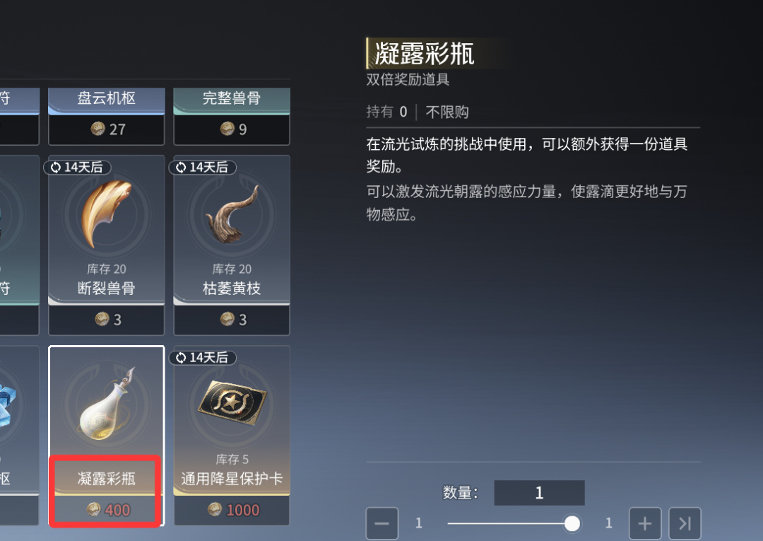 每日任务会给你1000的特殊货币,前期我建议买这个瓶子,因为这游戏回体力太慢了,瓶子可以让你打每日本多获得一次材料。而且是无限购的,没必要特意屯,后期再考虑屯其他瓶。