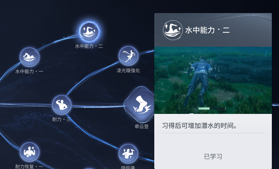 最后大世界探索,前期只推荐强化水中能力,这游戏潜水的解密有点多。
