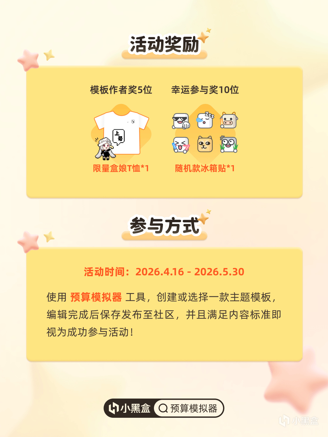 使用「预算模拟器」小程序,创建有料又有趣的主题模板,使用你的模板并带话题 #预算模拟器# 发布内容,保证内容原创性并符合小黑盒社区规范,即可成功参与活动。