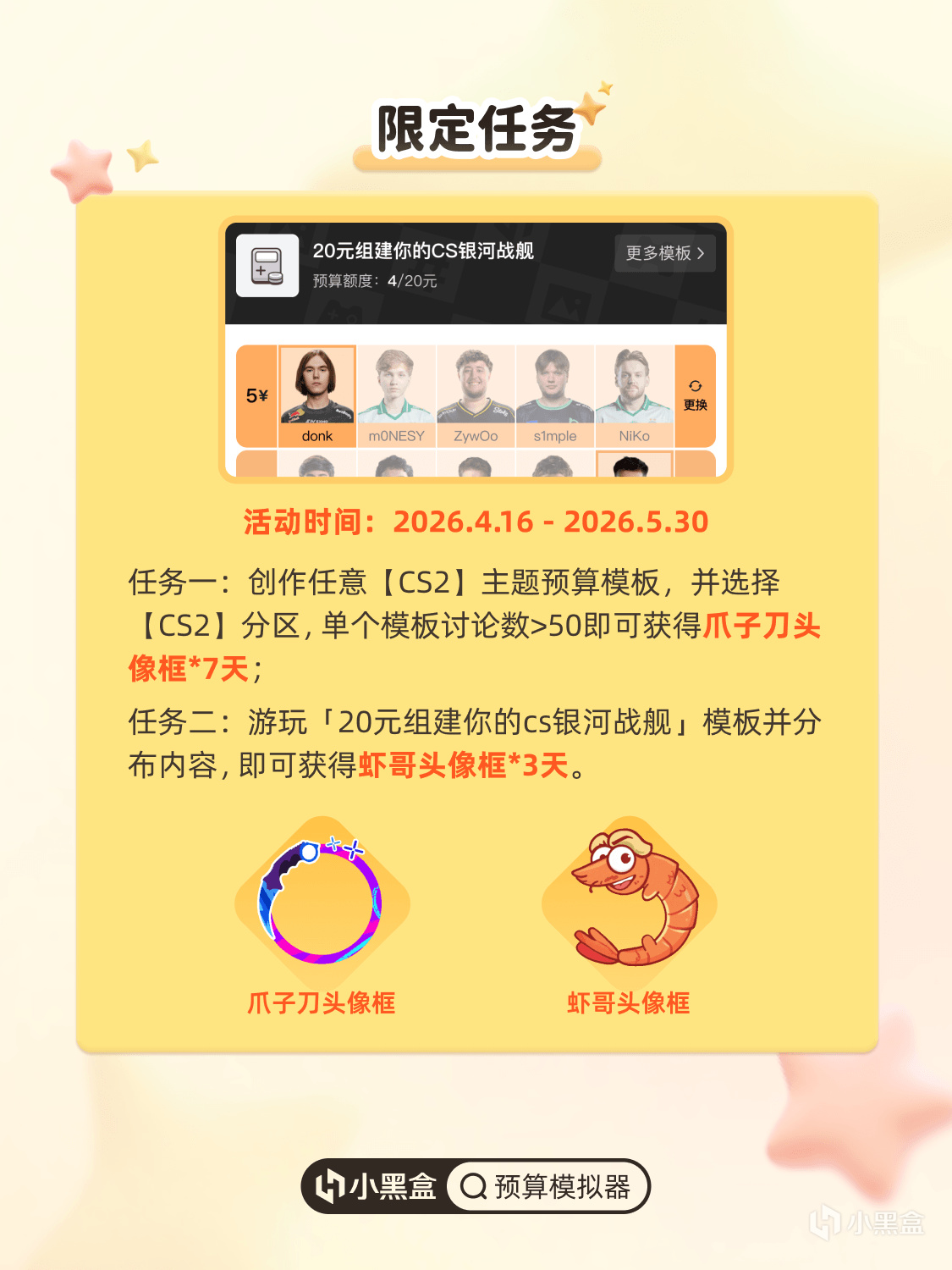 2. 任务二:游玩「20元组建你的CS银河战舰」模板并分布内容,即可获得「虾哥头像框*3天」。