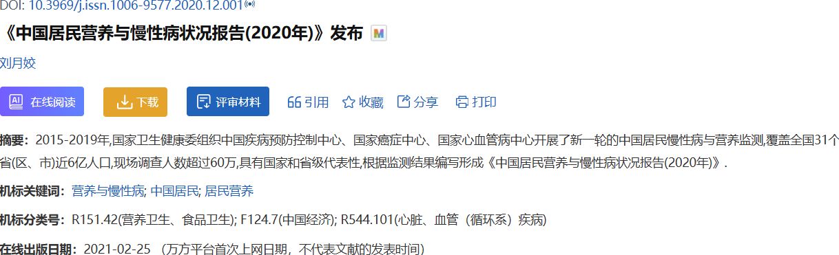 文献1:刘月姣. 《中国居民营养与慢性病状况报告(2020年)》发布[J]. 中国食物与营养,2020,26(12):封2. DOI:10.3969/j.issn.1006-9577.2020.12.001 .