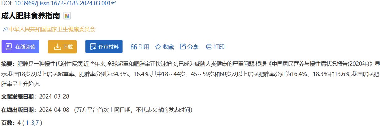 文献2:中华人民共和国国家卫生健康委员会. 成人肥胖食养指南[J]. 中国实用乡村医生杂志,2024,31(3):1-3,7. DOI:10.3969/j.issn.1672-7185.2024.03.001 .