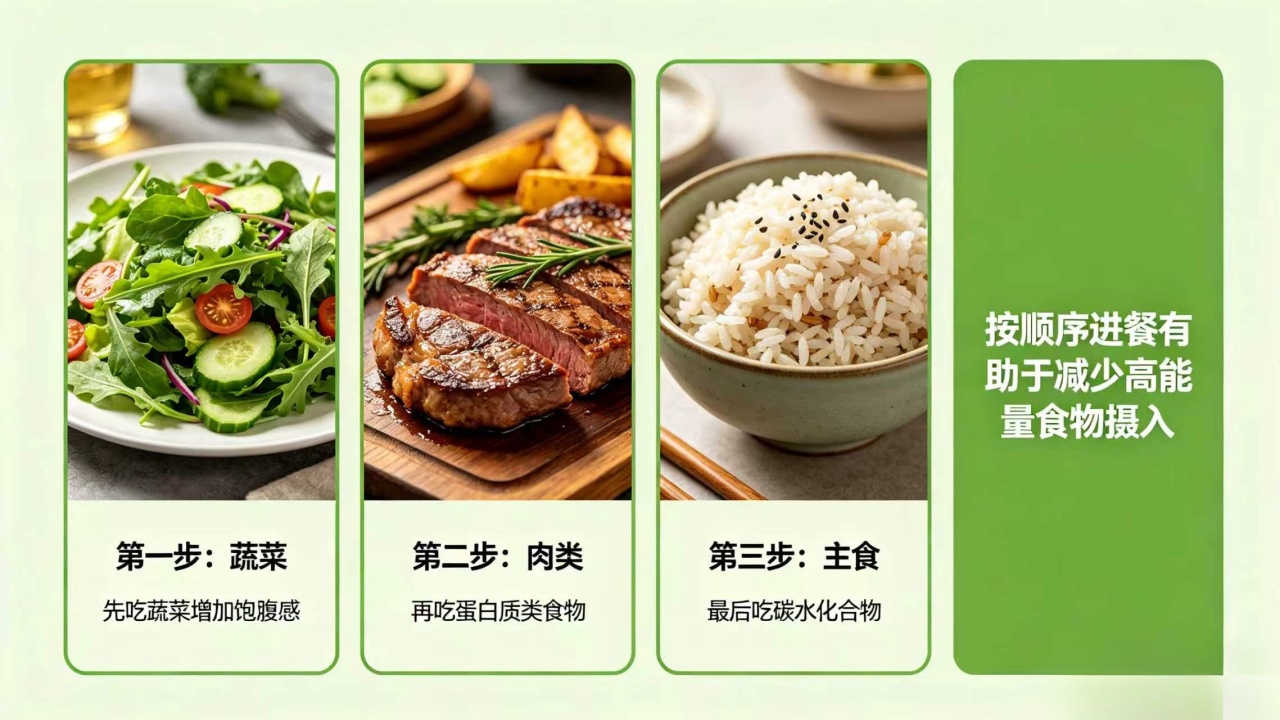 ④适当改变进餐顺序:按照蔬菜→肉类→主食的顺序进餐,简单有效,有助于减少高能量食物的摄入。