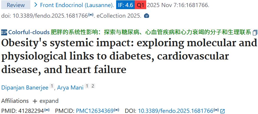 文献3:Banerjee D, Mani A. Obesity's systemic impact: exploring molecular and physiological links to diabetes, cardiovascular disease, and heart failure. Front Endocrinol (Lausanne). 2025 Nov 7;16:1681766. doi: 10.3389/fendo.2025.1681766 . PMID: 41282294; PMCID: PMC12634369.