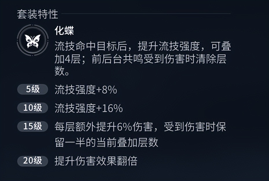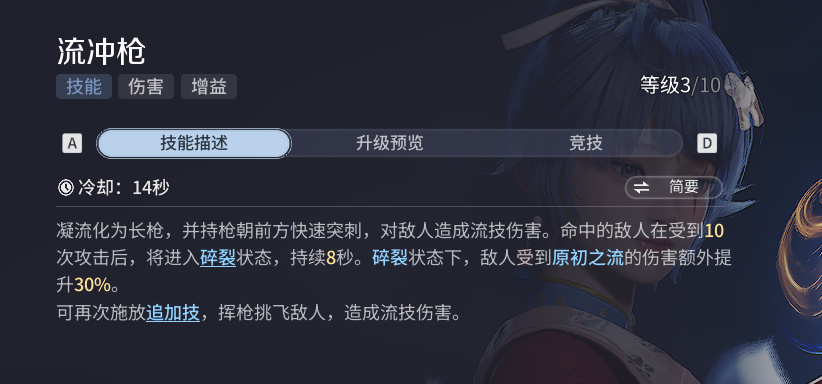 枪技能突刺并在刺中并受到十次攻击后给敌人上DEBUFF,让元流之子对其造成伤害提升30%,追加技是将敌人挑飞方便进行空中连段。后续有两个流脉与枪技能有关,一个效果是碎裂状态下对敌人增伤从30%变为70%。一个是增伤时间延长到16秒,枪技能算是元流之子的核心自拐能力,建议选第一个获取高额增伤。