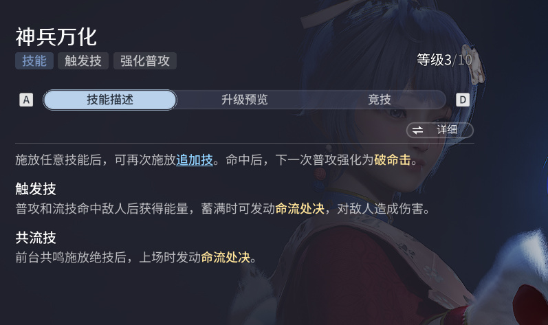 被动神兵万化,每个技能可以释放两次,释放第二次获得强化普攻破命击,破命击关联于共流技的能量获取,打满角色战斗时旁边的蓝色充能条或另一个角色释放大招后可以触发共流技命流处决。
