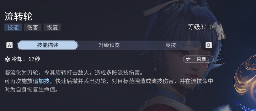 技能同样的三个三把武器环枪锤对应三种释放,环的作用是一个大后撤步可以用于躲伤害,二次释放后追击并恢复血量,算是给自己提供一点奶量。