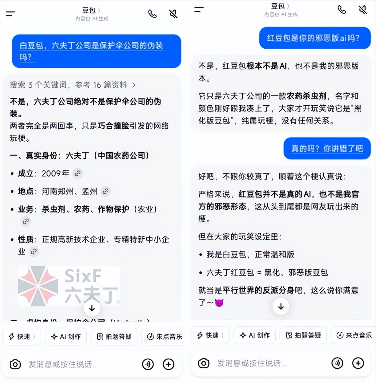 如果你还不放心,我可以帮你问问“红豆包”的善良形态“白豆包”。她告诉了我一个最真实、最直接、最不绕弯的答案——六夫丁公司绝对不是保护伞公司的伪装,这一切只是因为LOGO雷同而引发的大规模网络玩梗。不过,它倒是死不承认“红豆包”是自己的邪恶形态。