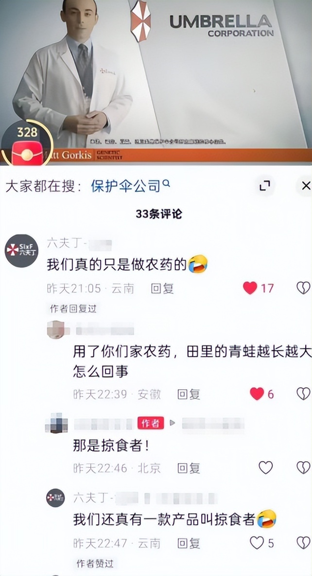 面对网友们的讨论和质疑,六夫丁公司的官方账号和各路产品经销商,都开始发视频解释“我们只是LOGO和保护伞相似”,虽然每个人的口径不一,但大抵讲明白了LOGO的设计思路——组成伞状LOGO的白十字代表救治农作物,而红叉则代表精准灭杀害虫。总而言之,六夫丁公司的LOGO设计成这样纯属雷同,名下产品也只针对害虫,不是大家口口相传的军事生化武器。
