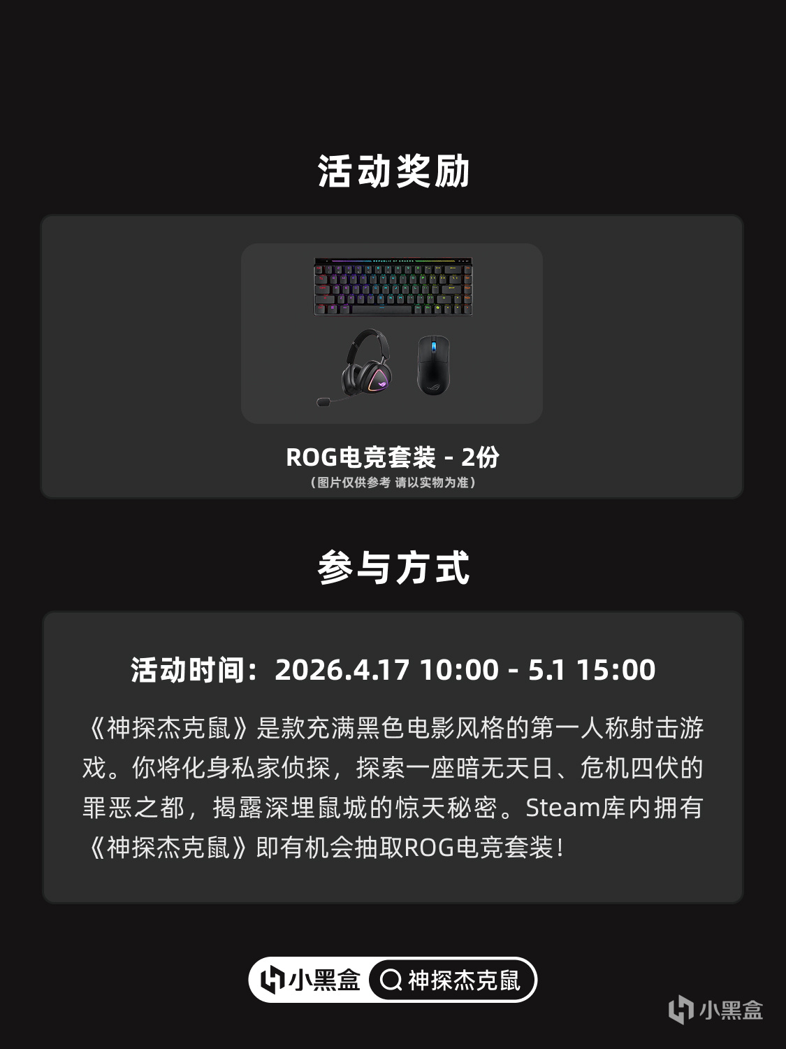 最佳神探奖(2名):ROG 电竞套装(内含 ROG 魔导士 PBT、龙鳞 mini、棱镜 2;奖品以实际发放为准)