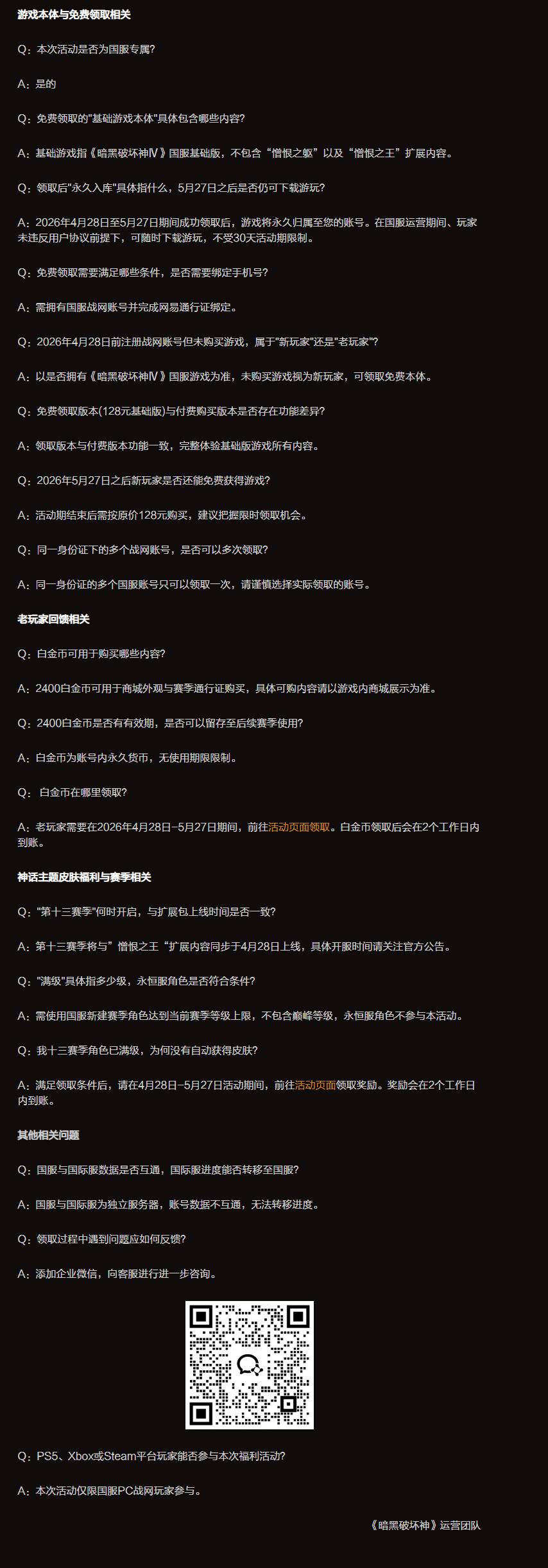 • 凡在4月28日之前已擁有任意版本國服《暗黑破壞神Ⅳ》的玩家,均可在4月28日0點至5月27日23:59期間免費領取 2400 白金幣!