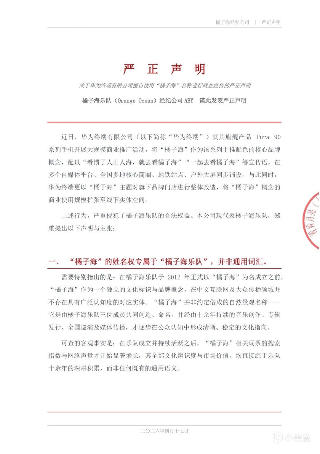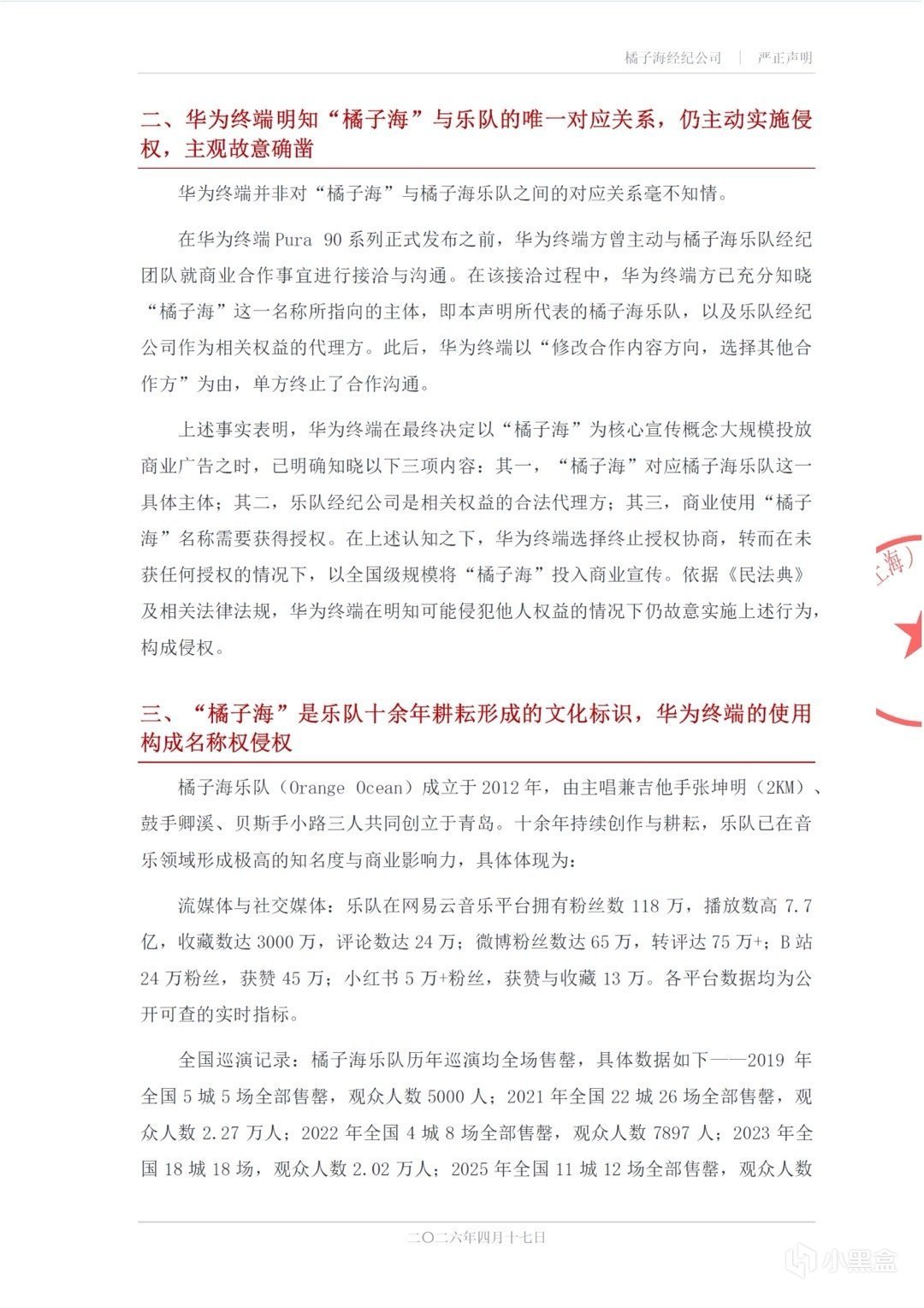 在华为终端 Pura 90系列正式发布之前,华为终端方曾主动与橘子海乐队经纪团队就商业合作事宜进行接洽与沟通。在该接沿过程中,华为终端方已充分知晓 “橘子海”这一名称所指向的主体,即本声明所代表的橘子海乐队,以及乐队经纪公司作为相关权益的代理方。此后,华为终端以“修改合作内容方向,选择其他合作方”为由,单方终止了合作沟通。
