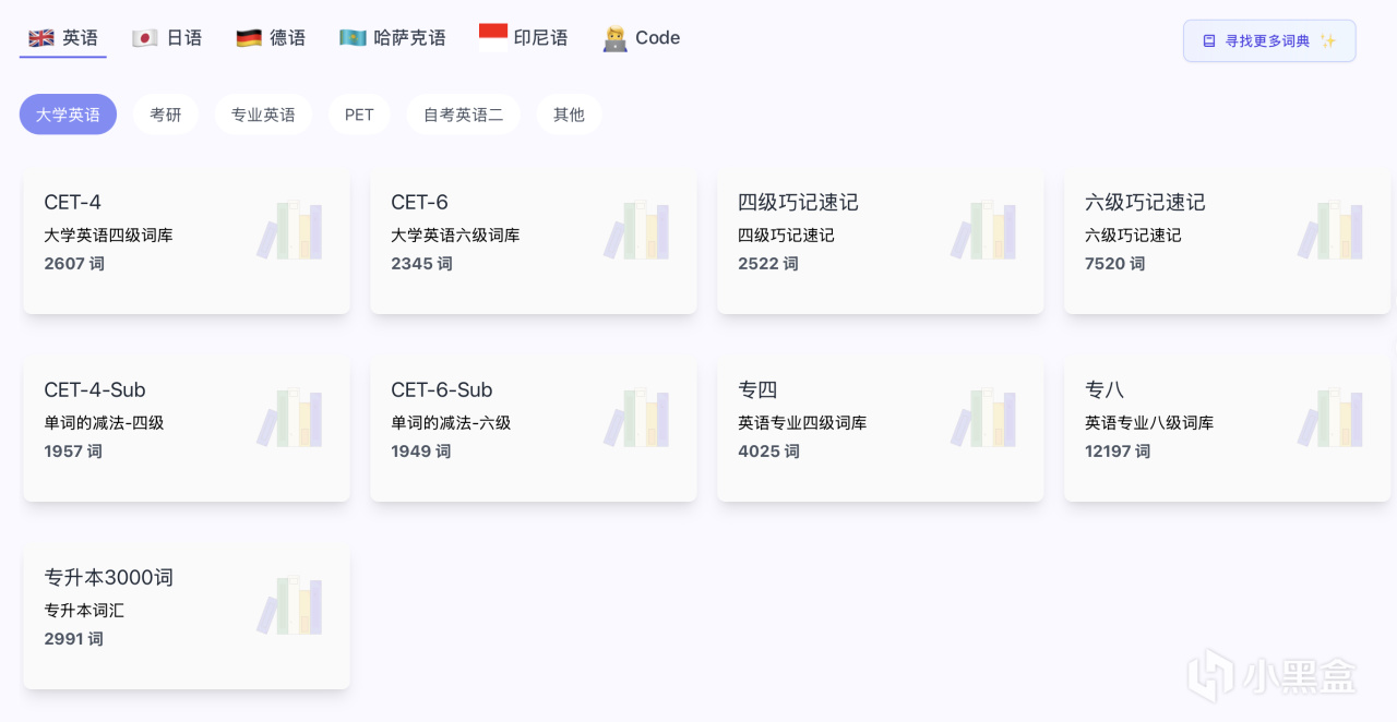 这个网站已经内置了常用的 CET-4 、CET-6 、GMAT 、GRE 、IELTS 、SAT 、TOEFL 、考研英语、专业四级英语、专业八级英语词库。