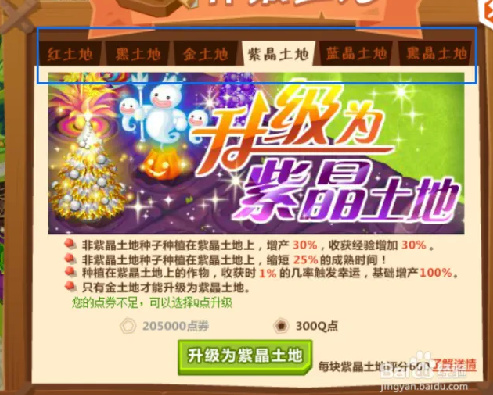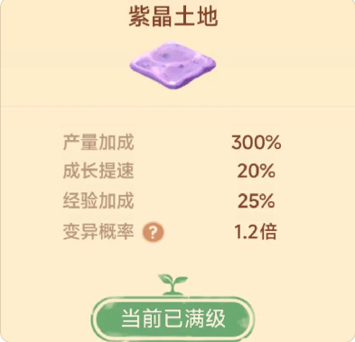 根據官方說明,紫晶土地可以種"金財神"等高級作物,經驗值和金幣收益更高。