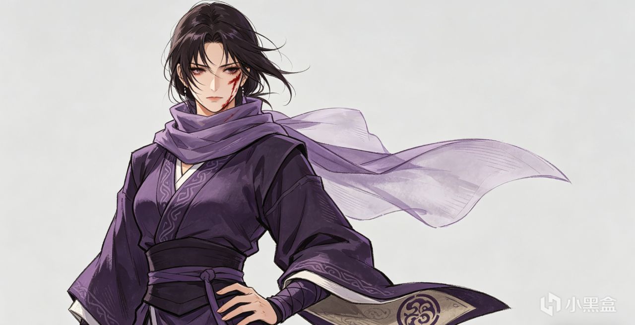 她永远身着一身洗得发白的深紫色劲装,日日夜夜,年年如此,这件紫衣是她家族留下的遗物,衣摆内侧绣着早已遗忘在历史长河的家族徽记;面巾下是一张极其清丽的脸,但左脸有一道从眉骨延伸到下颌的疤痕。