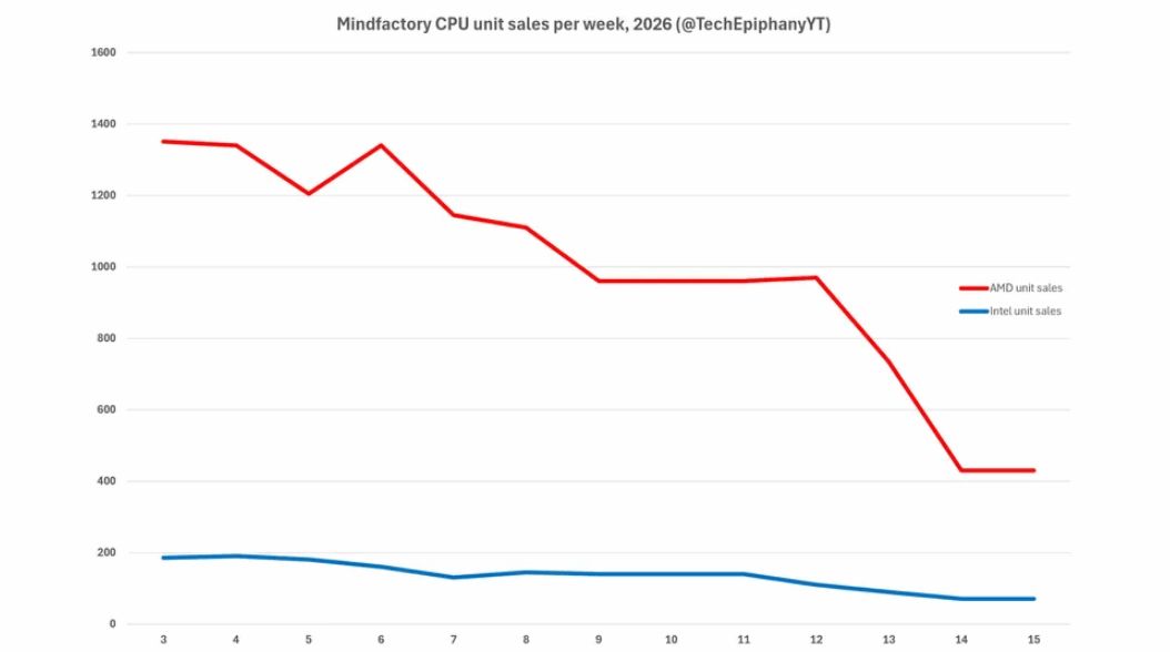 据PC Gamer近期报道,今年第3周到第15周,AMD与Intel处理器销量整体呈现明显下滑趋势。核心数据由YouTube科技频道TechEpiphany整理并发布。该频道长期跟踪德国大型零售商Mindfactory的周销量数据,Mindfactory被视为欧洲DIY PC市场的风向标之一。