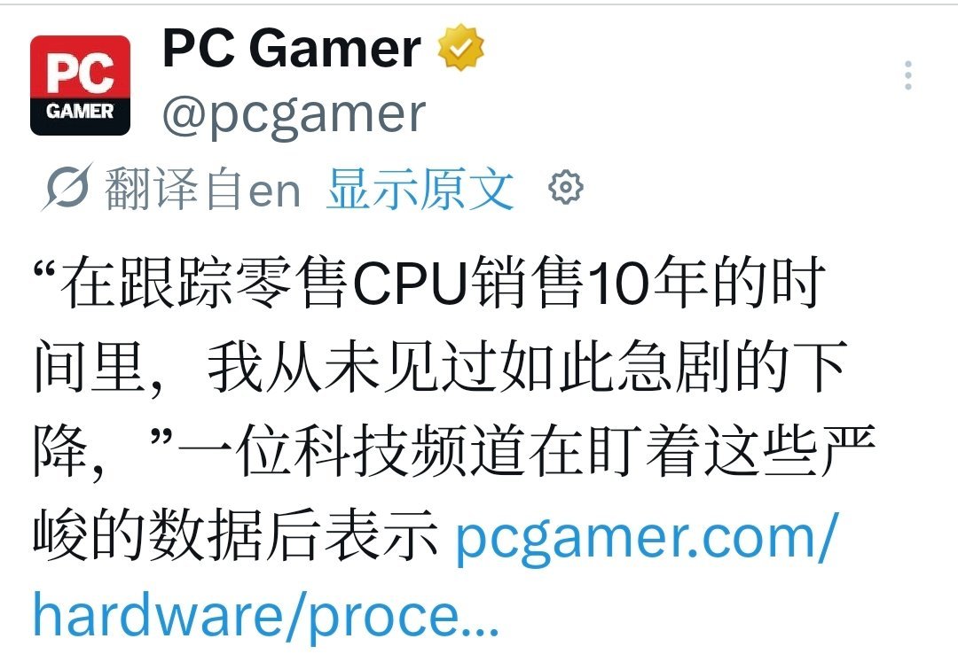 TechEpiphany在网上上直言:“10年来跟踪零售CPU及相关销量,这是我见过最陡峭的一次下跌。”他甚至在后续回复中用“11.5级危机”来形容严重程度。
