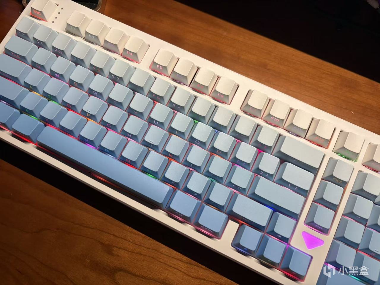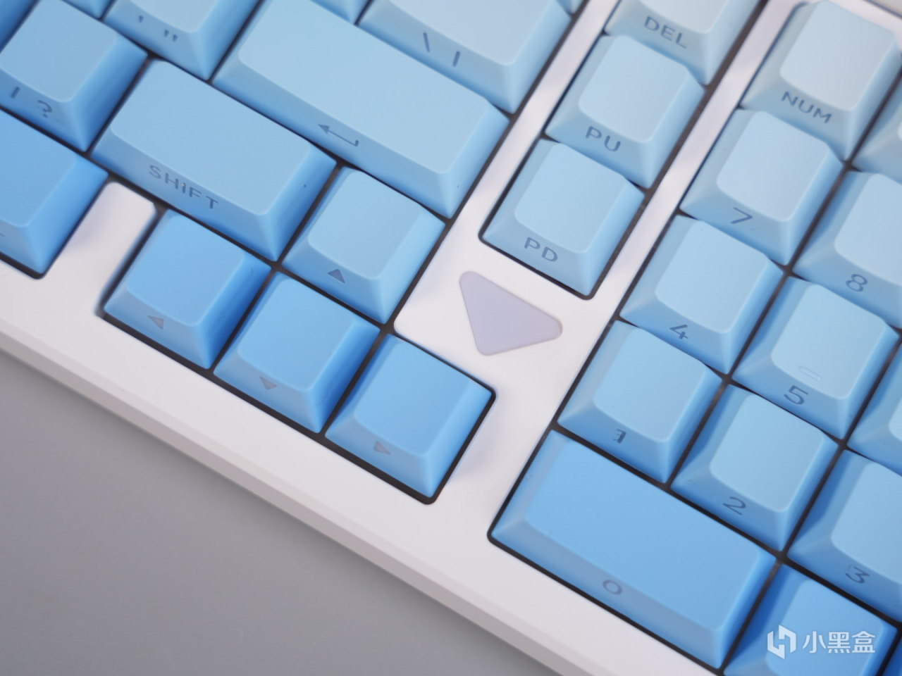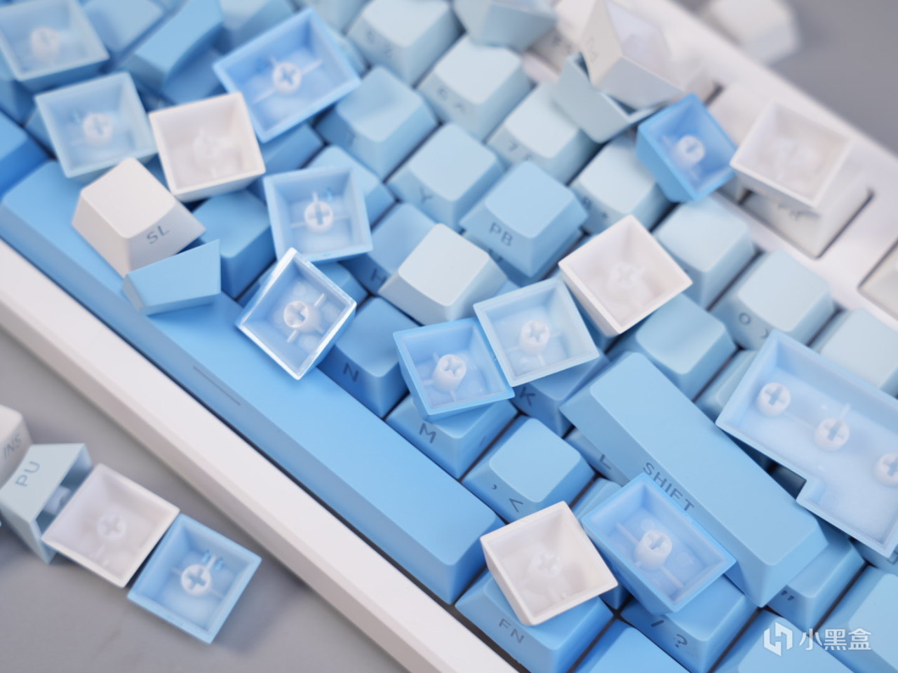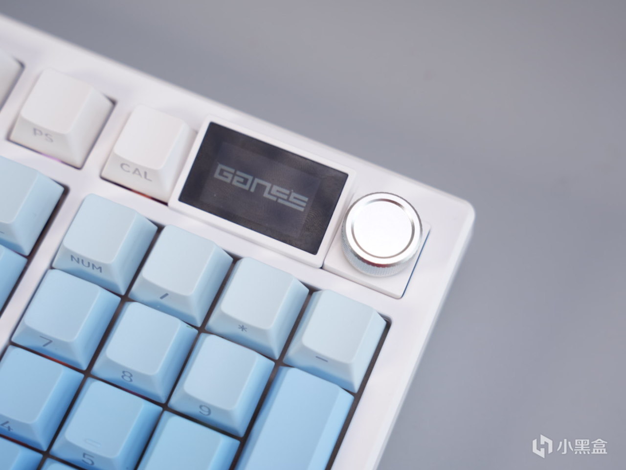 3101T PRO的键帽也继承了高斯一贯超多配色可选的特点,这次baby选了白蓝渐变的配色。键帽整体是原厂高度,PBT材质,这个用料在当前价位也算是比较常见的配置了。