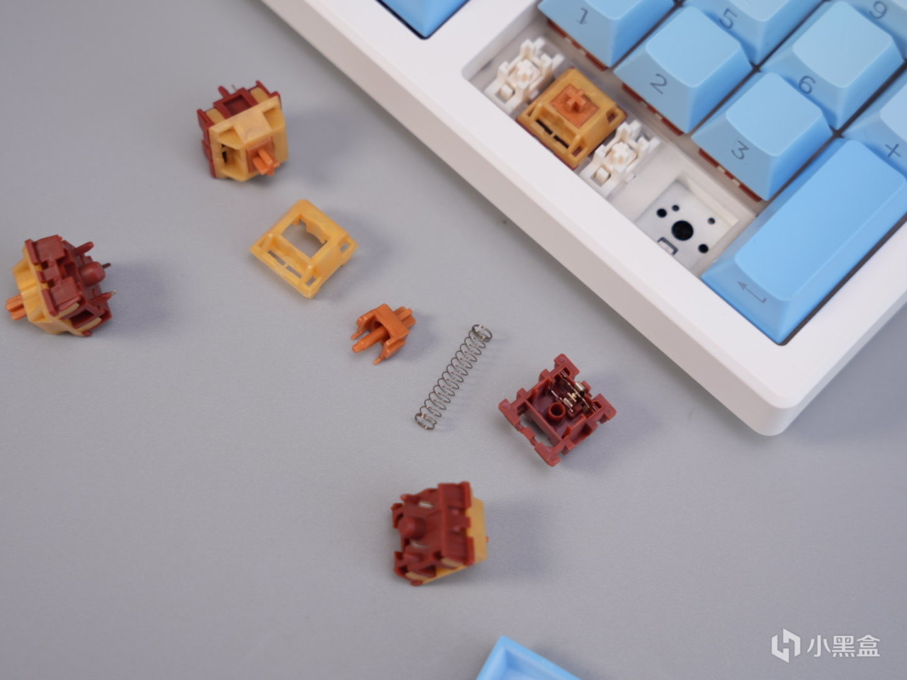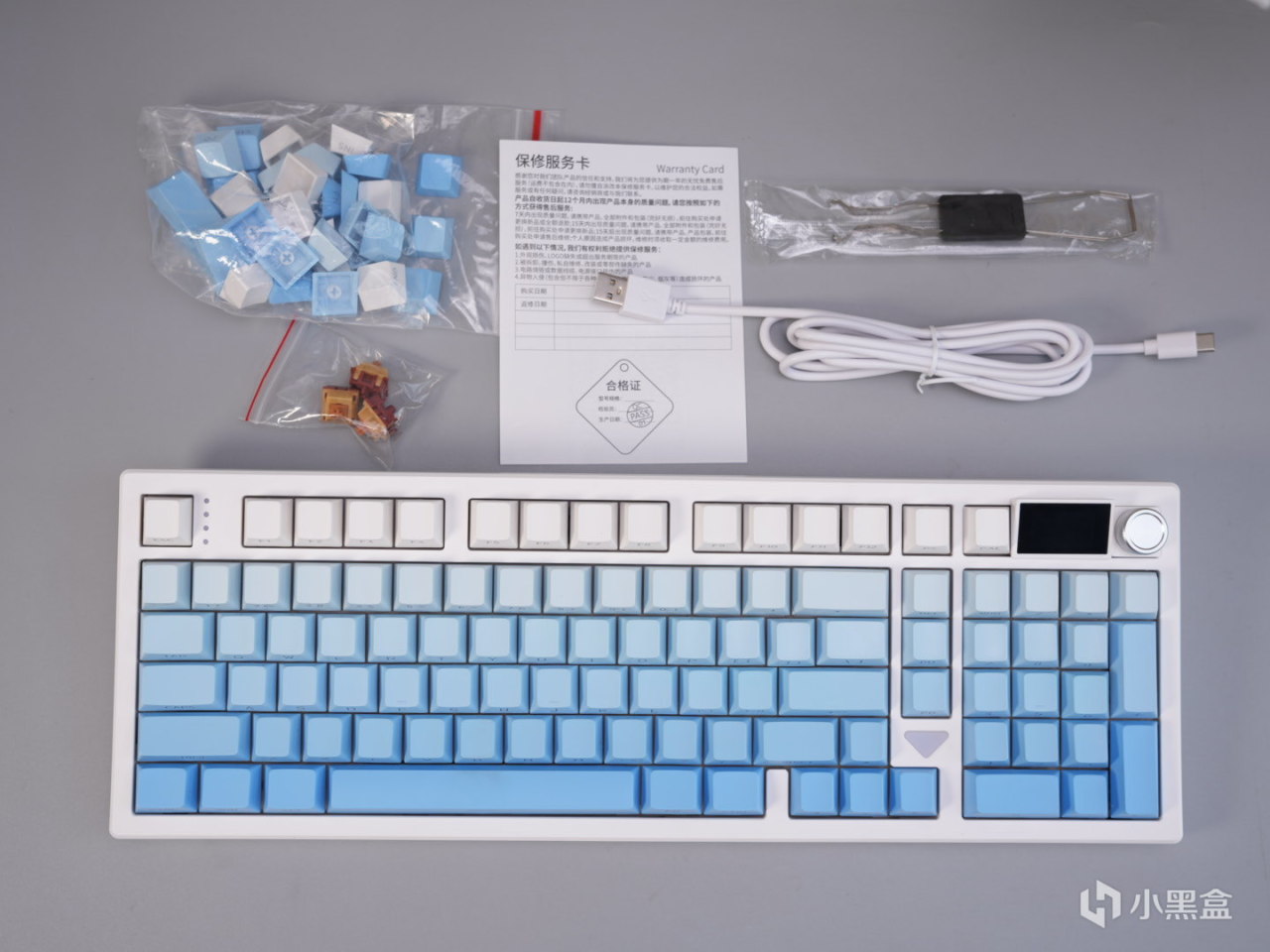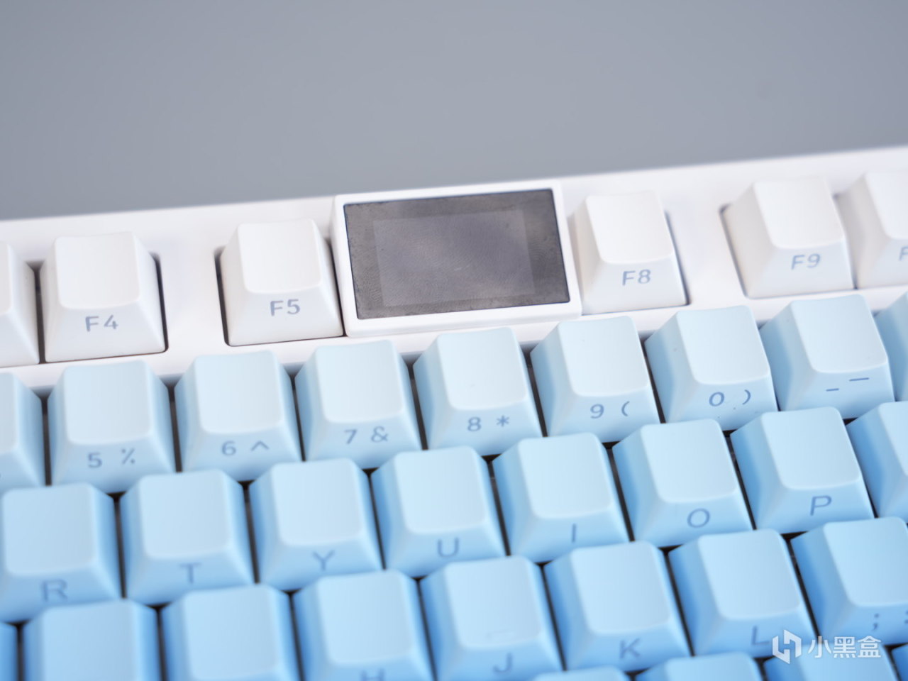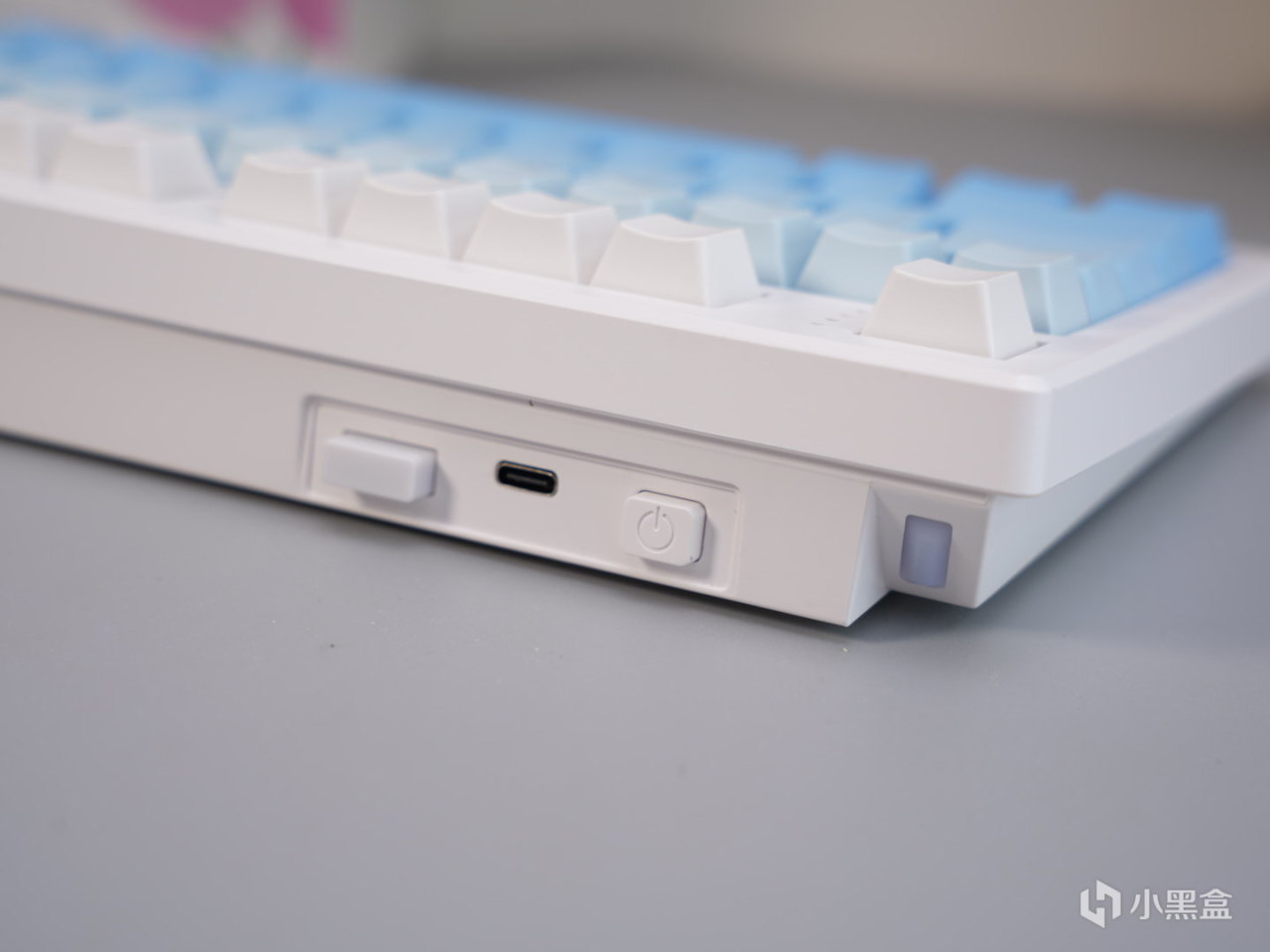 3101T PRO的键帽也继承了高斯一贯超多配色可选的特点,这次baby选了白蓝渐变的配色。键帽整体是原厂高度,PBT材质,这个用料在当前价位也算是比较常见的配置了。