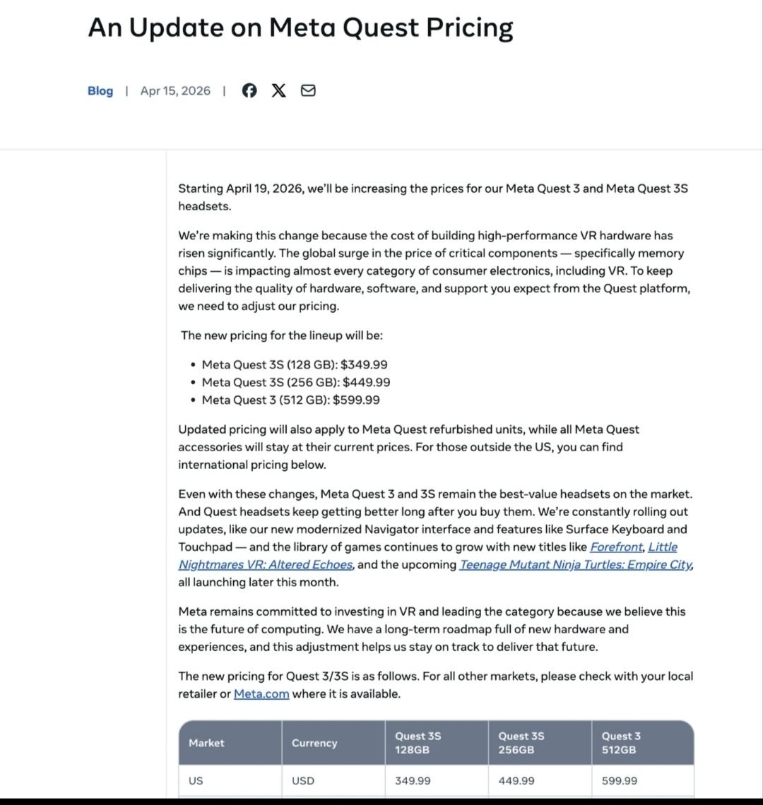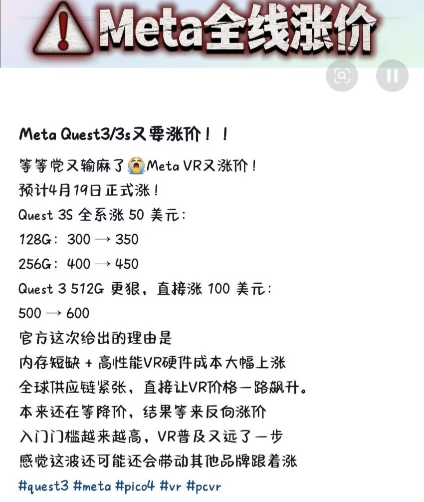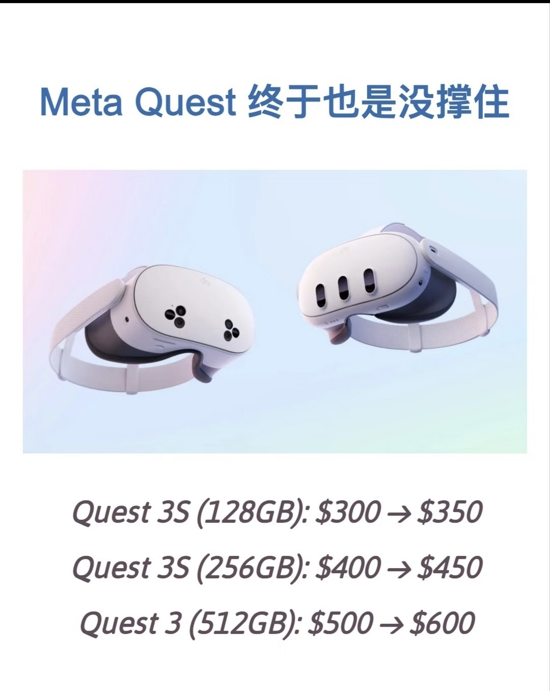 Meta刚刚官宣要涨价了!从这周日(4月19日 开始,Quest系列VR头显价格全面上调!
