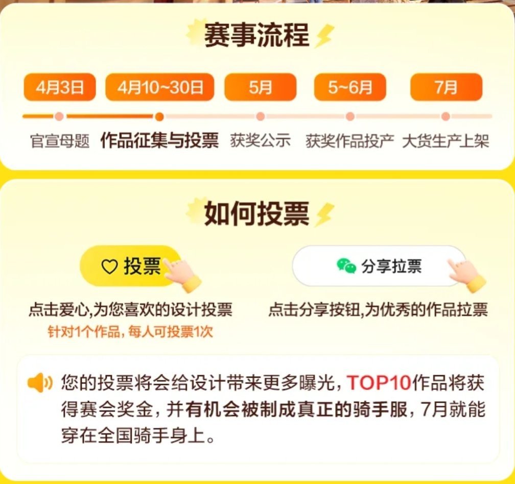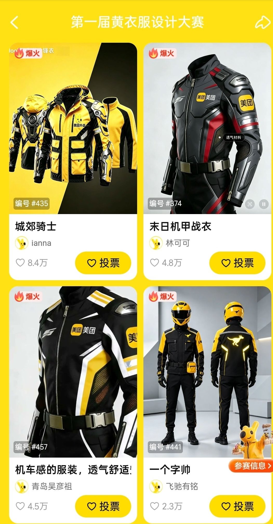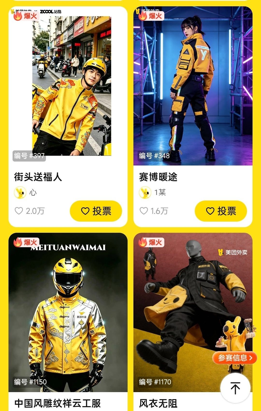 美团外卖正在举办的“第一届黄衣服设计大赛”,用120万元总奖金向公众征集兼具功能性与潮流感的骑手服设计方案,五月获奖公示,七月大批量上架。