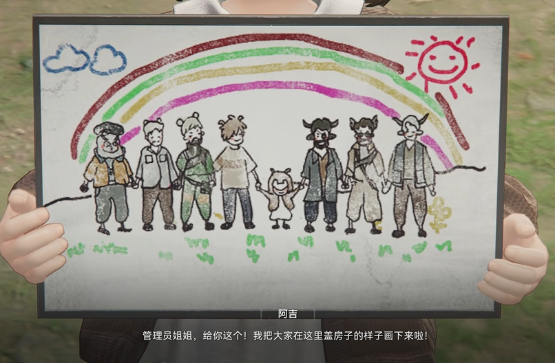 當你完成了避難所的重建後,阿吉爲管理員送上了一張重建成員的全家福,這時有人可能要問了,爲什麼這畫裏沒有管理員?那是你沒仔細看,當你把目光放到右上角,看到那個長出了眼睛和嘴巴的太陽,你就知道管理員被畫在哪裏了。