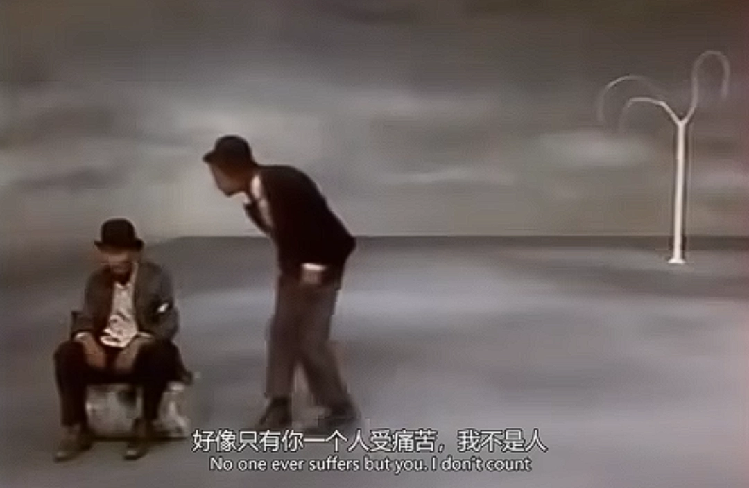 直到其中一个人,因为鞋子不合脚,实在脱不下来,在那里痛得直叫唤。另一位听见了,慢慢挪了过来,这才有了接下来的整部戏剧。我觉得,你大概能猜出来,另一位都抱怨了什么话。