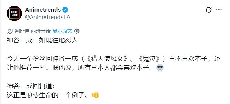 近期有一名粉丝向神谷英树请求道:“您喜欢本子吗?给我推荐10部本子吧,所有日本人都喜欢本子。”