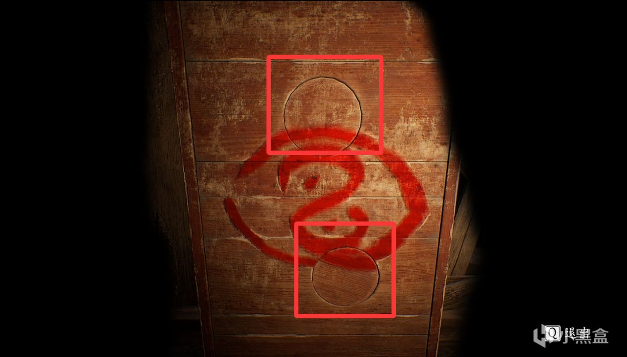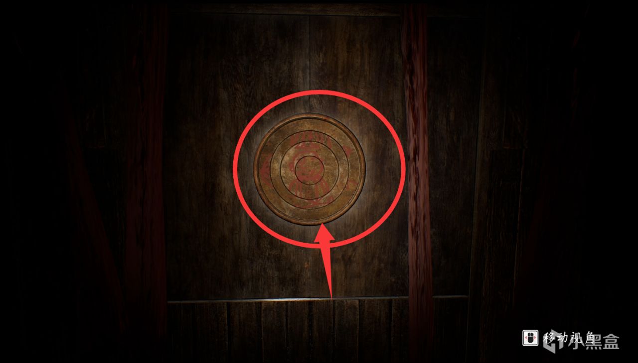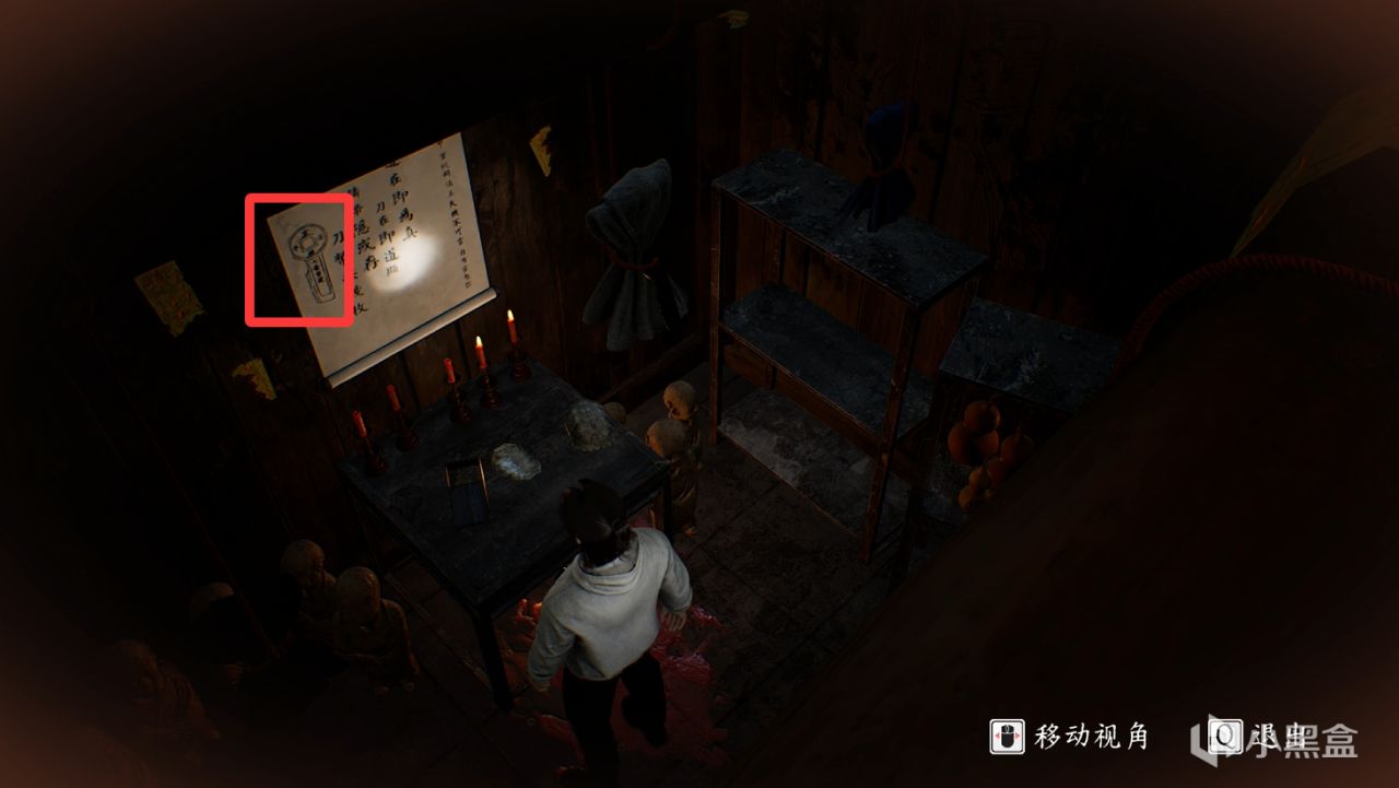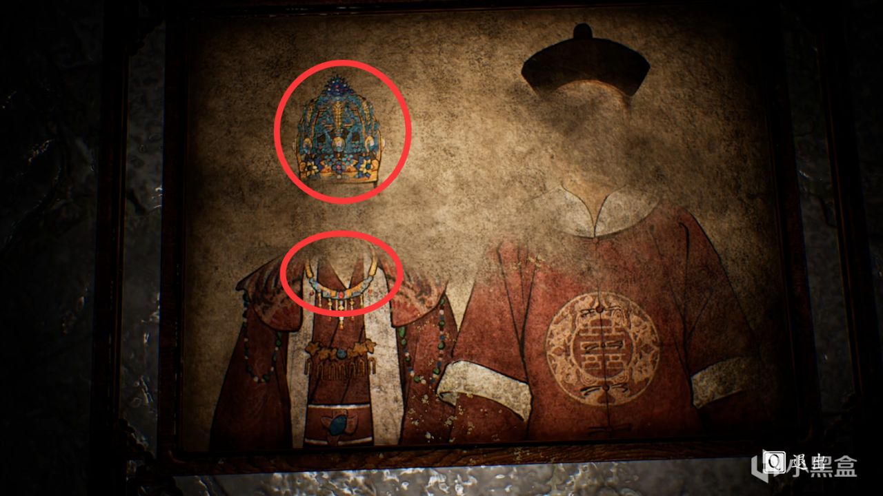 材料房的屋外視角有解謎的畫像,可以讓假人房間的人放好“頭飾+掛飾”