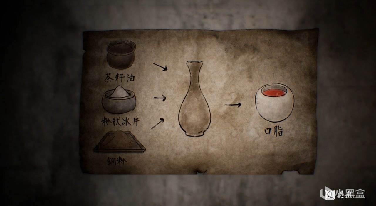 茶籽油(配方在假人房)+粉狀冰片(配方在材料房)+銅粉(配方在假人房)