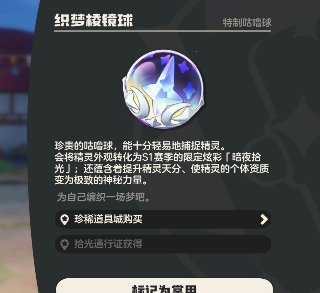 效果:100%捕捉成功,直接给满天赋值3条+10,而且还能给宠物附上S1限定的“暗夜拾光”炫彩,毫无疑问最稀有的球。
