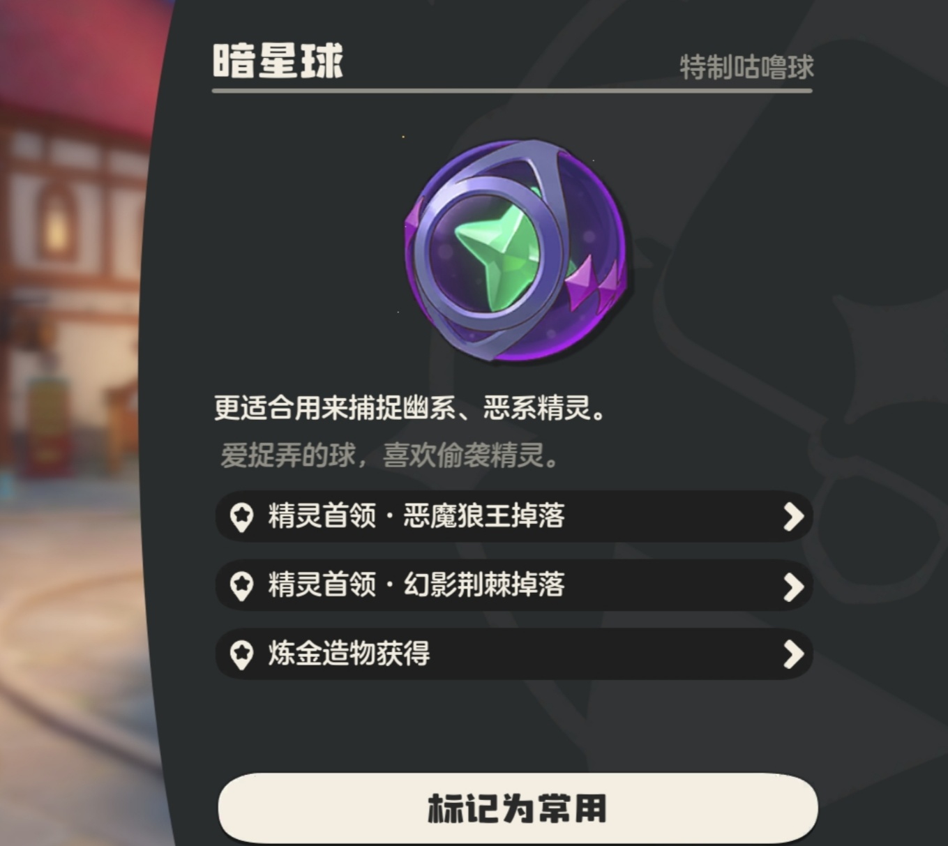 效果:对对应系别的宠物捕捉率有加成,成功率20%。比如暗星球对幽系、恶系加成,好战球对火系、龙系加成。