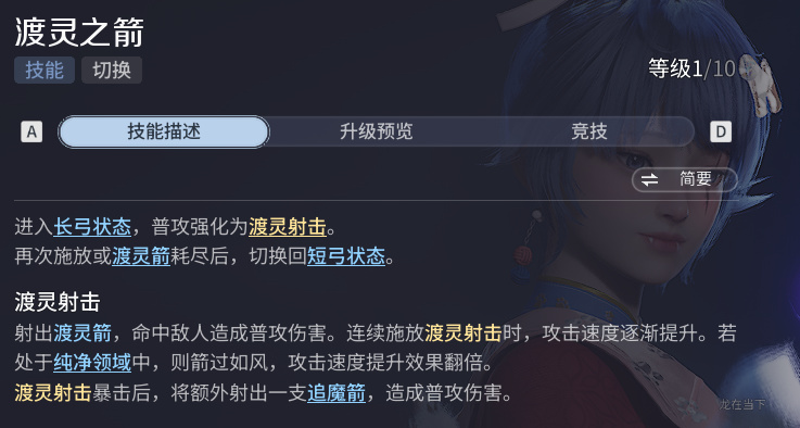 四層把渡靈箭儲存上限提升到十五,減少操作量提升爆發度,讓渡靈箭獲取溢出的情況減少。六層兩個一個是追魔箭傷害+30%一個是渡靈射擊額外10%暴擊率。前期肯定選後者,箭不暴擊都不出追魔箭,把暴擊率疊上去再說,