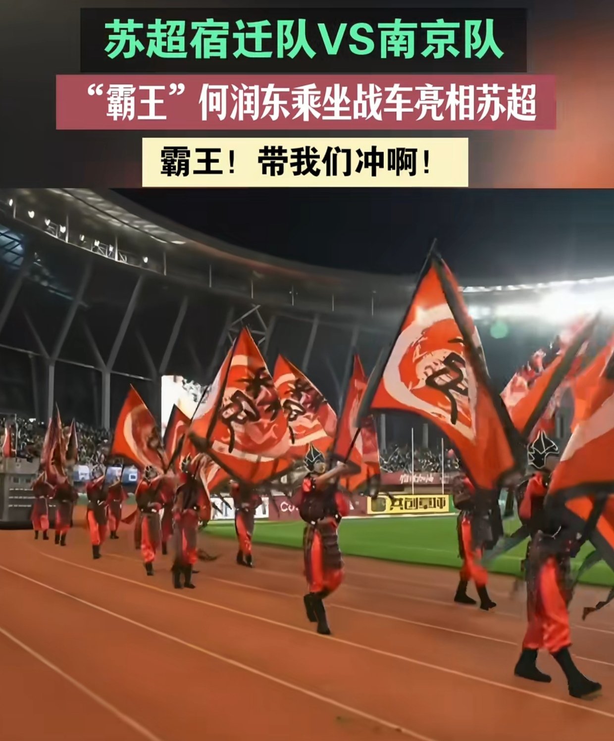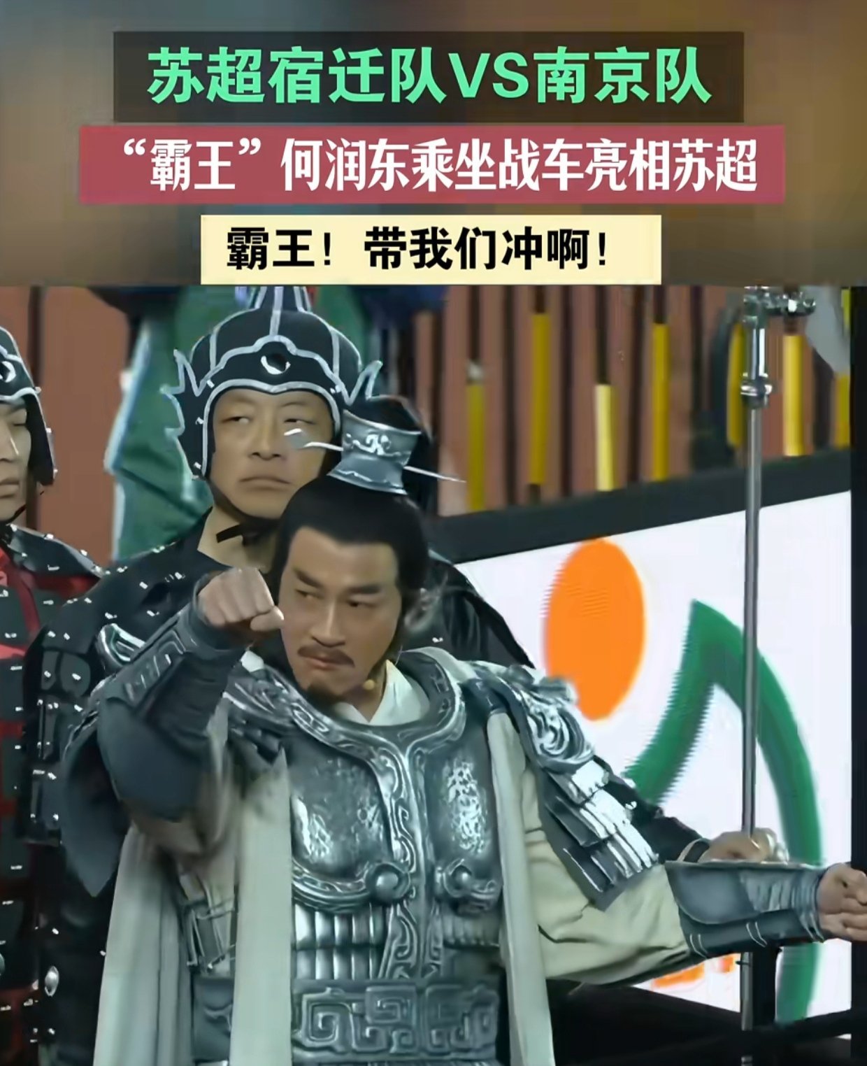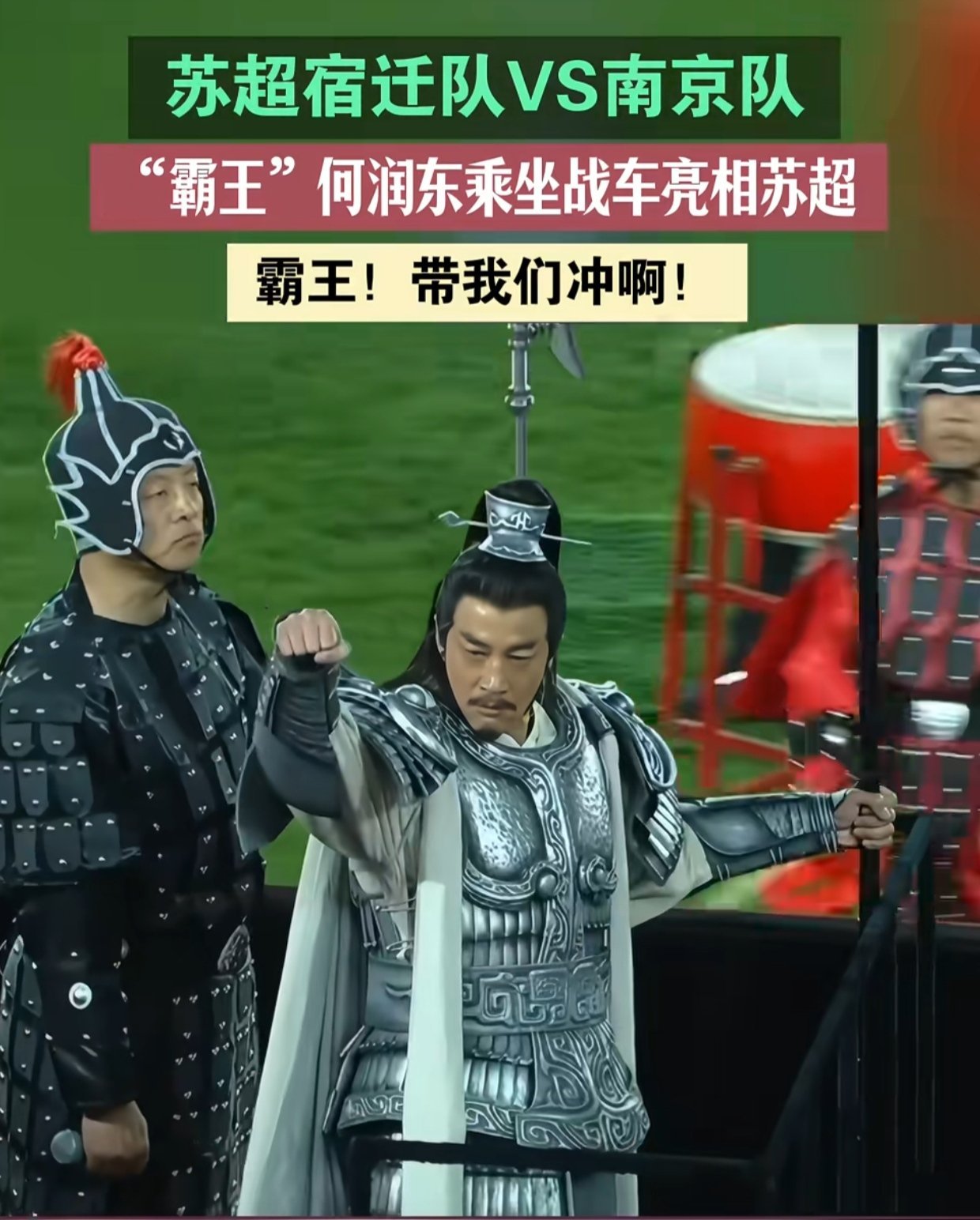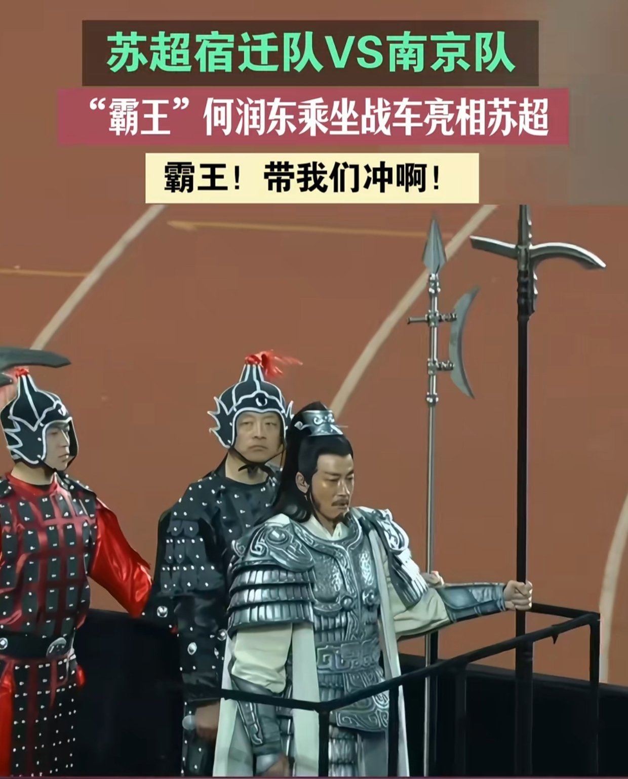 宿遷是項羽的故鄉,這場對陣南京的比賽本身就自帶“楚漢對決”的歷史梗,而宿遷文旅直接把“情懷殺”拉滿——特邀曾在《楚漢傳奇》中飾演項羽的演員何潤東,身披重達25斤的復刻版霸王戰甲亮相。這套戰甲由鎮江非遺傳承人團隊匠心打造,高度還原了劇中的經典造型,何潤東乘坐仿古戰車入場,手持兵器,身後是列陣而行的甲士與揮舞戰旗的儀仗隊,伴隨着戰鼓擂動,瞬間把賽場氛圍拉到頂點。他揮拳高呼的瞬間,全場球迷齊聲喊出“霸王!帶我們衝啊!”,彷彿穿越千年,見證霸王歸鄉。