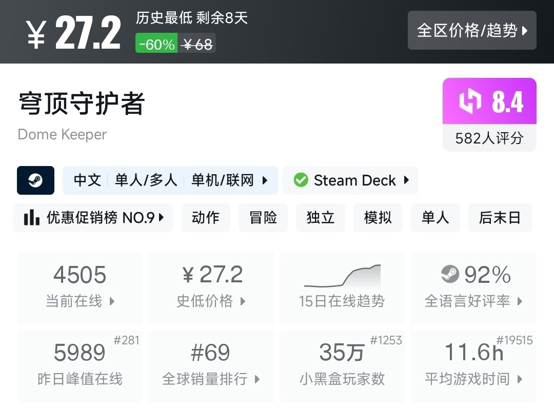 《穹顶守护者》是一款融合挖矿与基地防御的Roguelike生存游戏。核心循环为挖掘资源升级装备,并在怪物波次中守护穹顶,前期节奏紧凑、成就感强,像素风格简洁干净。虽然后期重复度较高,但仍不失为一部佳作。