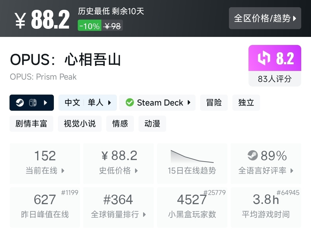 《OPUS:心相吾山》是一款以摄影为纽带的温情叙事冒险游戏。玩家扮演中年摄影师,通过拍照记录风景、解谜并面对人生过往。摄影机制与故事深度融合,画面柔美治愈,配乐富有情感层次,整体如成人童话般细腻动人。适合寻求治愈与人生思考的玩家,被视为近期最佳的叙事作品之一。