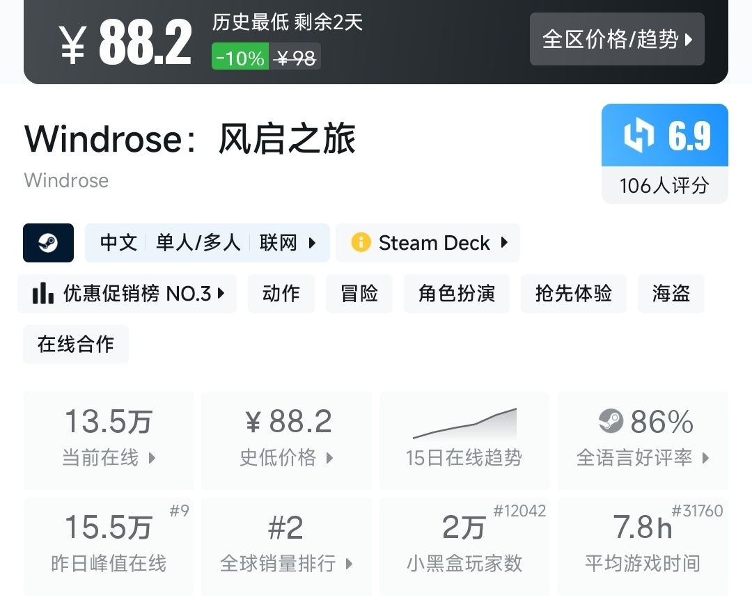《风启之旅》是一款海盗主题的开放世界生存冒险游戏。游戏提供了海陆无缝探索、造船、海战与基地建设,战斗氛围拉满,建造与探索乐趣十足,优化表现稳定。但EA版本探索内容重复、素材收集繁琐,单人后期易感疲惫。若后续更新丰富内容,潜力值得期待。
