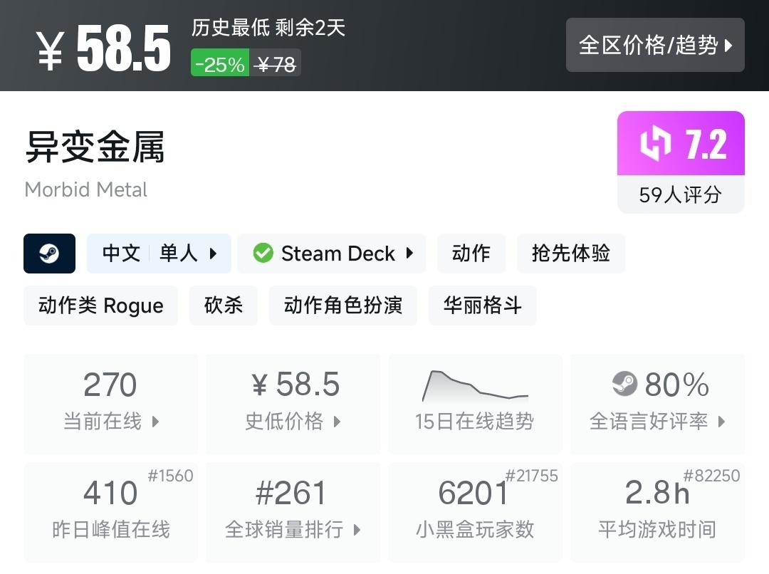 《异变金属》是一款赛博废土快节奏动作砍杀游戏,采用轻度Roguelike结构。游戏支持实时角色切换,连招华丽且打击感出色,Build成型后爽快度高,美术风格富有张力。本作的动作底子扎实,适合喜欢动作游戏的玩家。