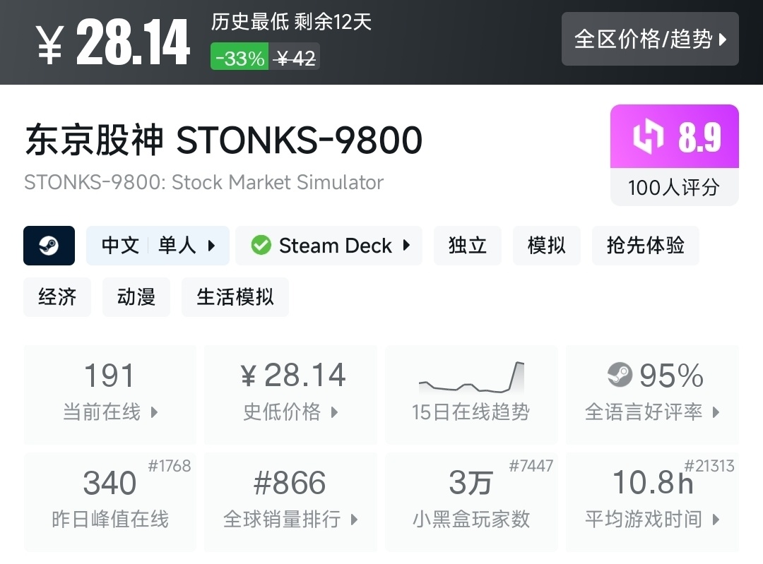 《东京股神 STONKS-9800》是一款以日本泡沫经济时代为背景的股市生活模拟游戏。玩家从零起步炒股、投资,穿插复古酒吧闲聊与时代互动,UI与氛围还原出色,资产增长的满足感强烈。游戏的操作友好,适合对炒股感兴趣的玩家。