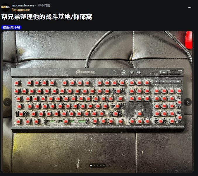 这位网友表示,这是他帮自己兄弟清理的。那把Corsair K70是2014年购买的经典款机械键盘,至今已经用了整整12年,却从未进行过彻底清洁。平时可能只是简单擦擦表面,键帽下面早就成了“尘土飞扬的战场”。