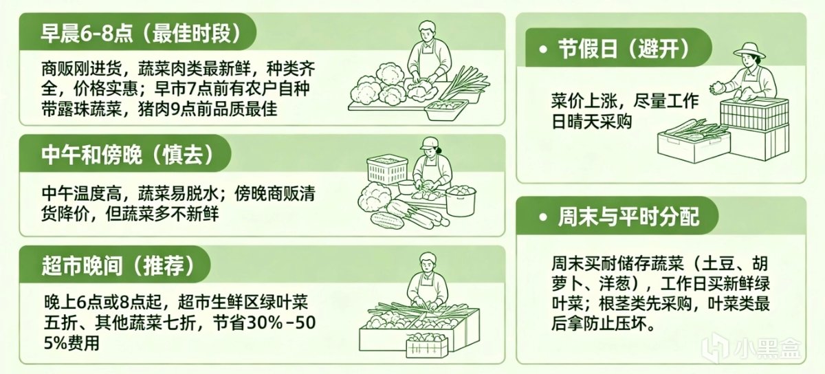 中午溫度高,蔬菜容易脫水、不新鮮。傍晚商販雖然急着清貨可能會降價,但很多蔬菜已經不新鮮了。如果你追求性價比,更推薦去超市:一般從晚上6點或8點開始,超市生鮮區會打折,綠葉菜五折、其他蔬菜七折,此時採購可節省約30%至50%的費用。