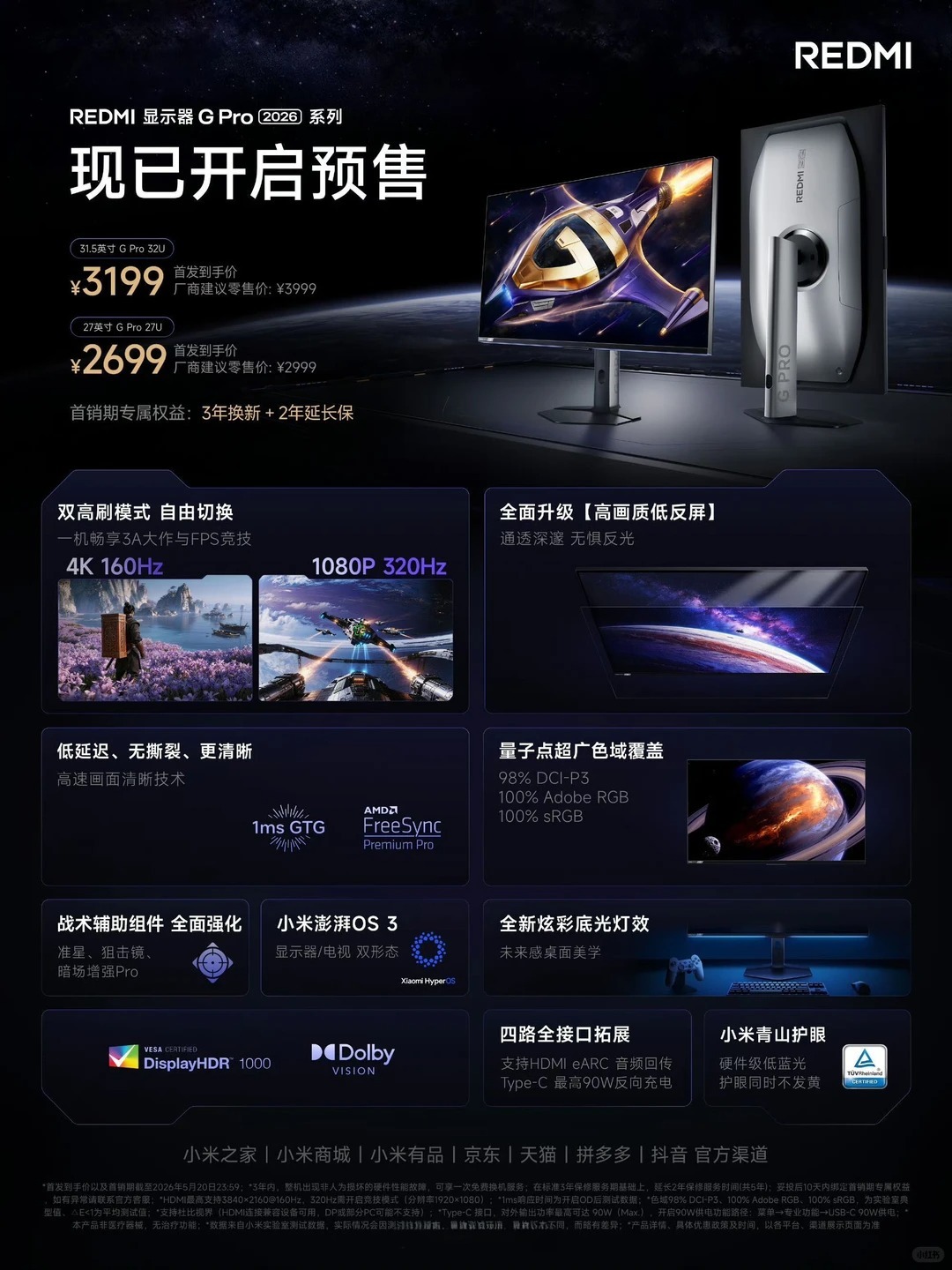 红米 G Pro 2026 系列开启预售,拥有27英寸和31.5英寸两个版本,27英寸版本售价不变。